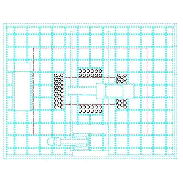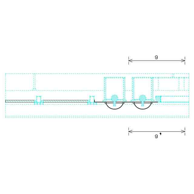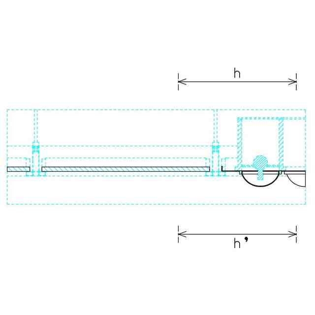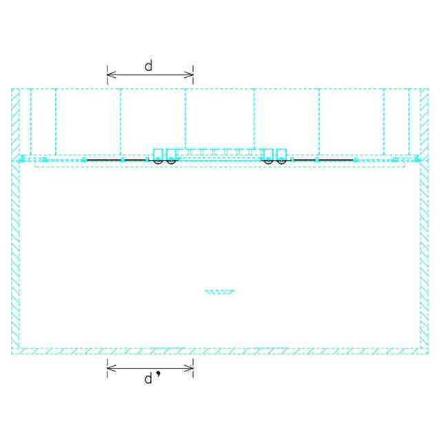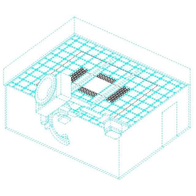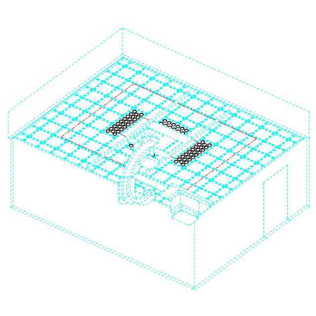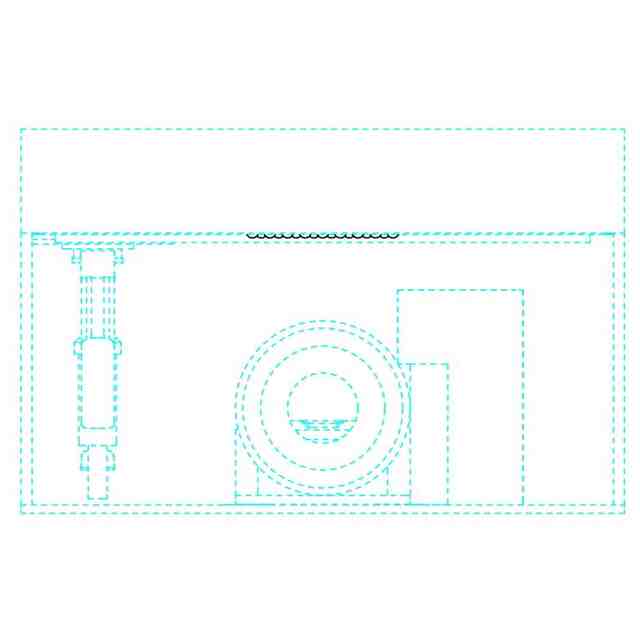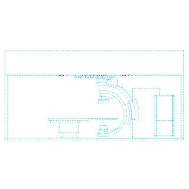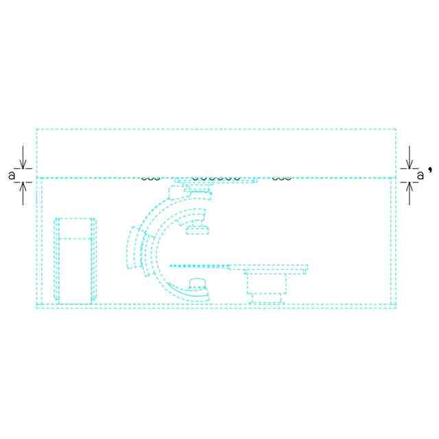 意匠登録を受けようとする部分を黒色の実線でそれ以外の部分を青色の破線で表した。赤色の一点鎖線は、意匠登録を受けようとする部分とそれ以外の部分との境界のみを示すものである。各断面図、各端面図とエア吹出口を表した状態の各図及びこれらの拡大図以外の図において、クリーンエア吹出パネルに設けられたエア吹出口(複数小孔)を省略している。正面・底面・左側面側からの斜視図は、正面及び左側面側の壁と床を省略した状態で表している。正面図、背面図、左右側面図は、各図手前に表れる壁を、底面図は床を省略した状態で表している。左側面側からの透視図、血管撮影装置を手術台に設置した状態の各図においては、断層撮影装置を省略して表している。A-A拡大断面図は左に90度回転させて表している。A-A拡大断面図及びB-B拡大断面図は、手術台を表した状態で表している。各断面図、各端面図において、内部構造及び内部機構を簡略化して表している。床や壁、天井内部は簡略化して表している。登録を受けようとする部分を示す参考図において、意匠登録を受けようとする部分に薄墨を施した。透光性を有する部分を示す参考図において薄墨を施した部分は面発光照明部分であり、透光性を有する。透明部を示す参考図において薄墨を施した部分は、シューティングライトのドーム状前面カバーであって透明である。なお、血管撮影装置を手術台に設置した状態の各図は、血管撮影装置本体を移動体とともに移動レールに沿って移動させ、手術台の方向に合わせて回動させた状態を表している。