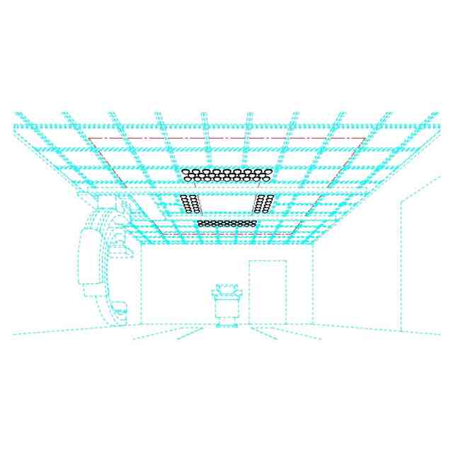 この内装は、手術台上方の天井面に複数のシューティングライトを設け、その周囲に面発光照明を配した手術室の内装である。照明方向の調整が可能なシューティングライトにより、どのエリアにおいても術野を高い照度で無影状態にて照らすことができるとともに、面発光照明によって全体を均一に照らすことで、室内を無影環境としたものである。これによって、従来使用されてきた天井懸垂式の手術灯(無影灯)を廃し、加えて室内全体を明るく照らすことができる。また、天井懸垂式の手術灯の設置の必要が無く、手術室の天井高さを低く設定できることから、階高を抑えて建物躯体のコストを削減できるほか、階高が低い外来や病棟等に手術室を設けたり、従来の病室を改修して手術室とすることも可能である。