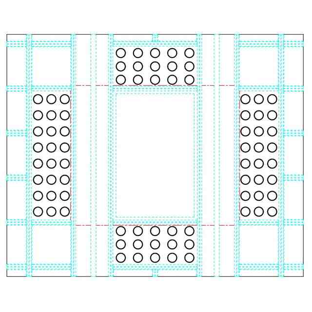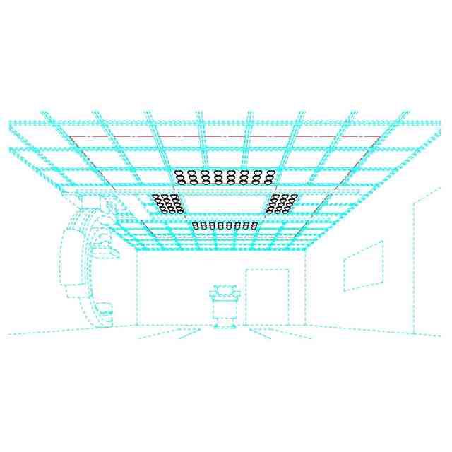 意匠登録を受けようとする部分を黒色の実線でそれ以外の部分を青色の破線で表した。赤色の一点鎖線は、意匠登録を受けようとする部分とそれ以外の部分との境界のみを示すものである。各断面図、各端面図とエア吹出口を表した状態の各図及びこれらの拡大図以外の図において、クリーンエア吹出パネルに設けられたエア吹出口(複数小孔)を省略している。正面・底面・左側面側からの斜視図は、正面及び左側面側の壁と床を省略した状態で表している。正面図、背面図、左右側面図は、各図手前に表れる壁を、底面図は床を省略した状態で表している。左側面側からの透視図、血管撮影装置を手術台に設置した状態の各図においては、断層撮影装置を省略して表している。A-A拡大断面図は左に90度回転させて表している。A-A拡大断面図及びB-B拡大断面図は、手術台を表した状態で表している。各断面図、各端面図において、内部構造及び内部機構を簡略化して表している。床や壁、天井内部は簡略化して表している。登録を受けようとする部分を示す参考図において、意匠登録を受けようとする部分に薄墨を施した。透光性を有する部分を示す参考図において薄墨を施した部分は面発光照明部分であり、透光性を有する。透明部を示す参考図において薄墨を施した部分は、シューティングライトのドーム状前面カバーであって透明である。なお、血管撮影装置を手術台に設置した状態の各図は、血管撮影装置本体を移動体とともに移動レールに沿って移動させ、手術台の方向に合わせて回動させた状態を表している。