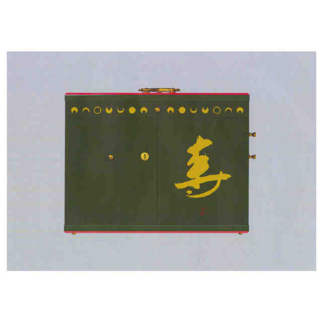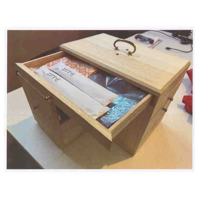 この物品は、数か所の引き出しを有し、お茶を淹れるために必要とする道具や材料を保管及び、持ち運ぶ為の木製で作られた茶箱である。
