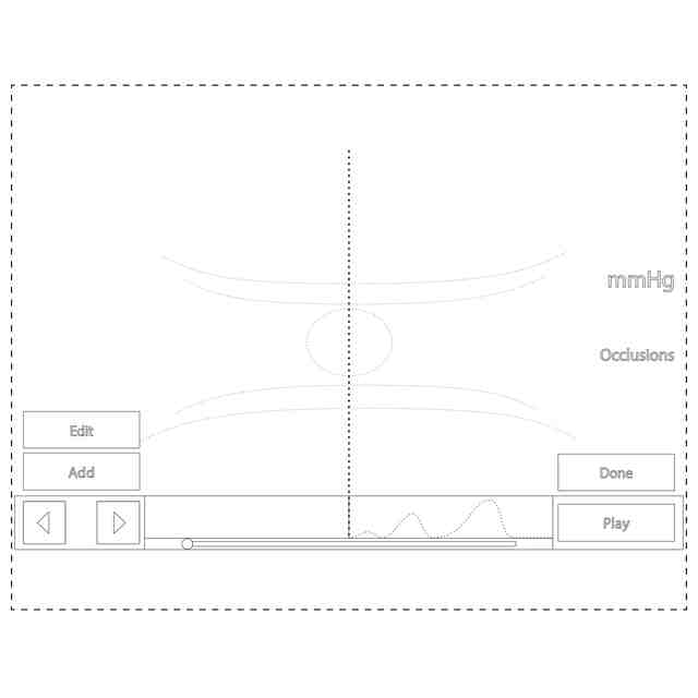 この画像は、インタラクティブな操作を介して、血管の超音波スキャンの記録を表示し、検査中に実行された閉塞をマークするために使用されるものである。記録中に当該画像は画像図1から2、3の順で漸次的に変化する。画面中央の点線の垂直線は、スキャン中に対象となる解剖学的構造を中心に保つための視覚的補助である。