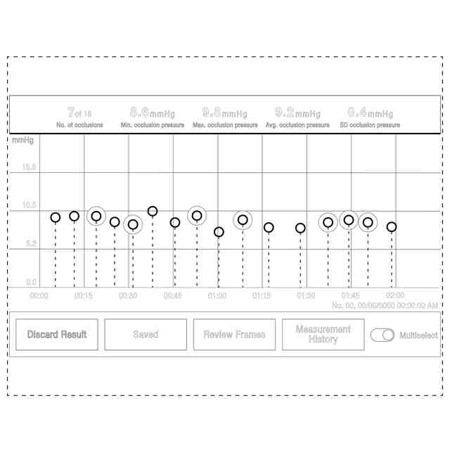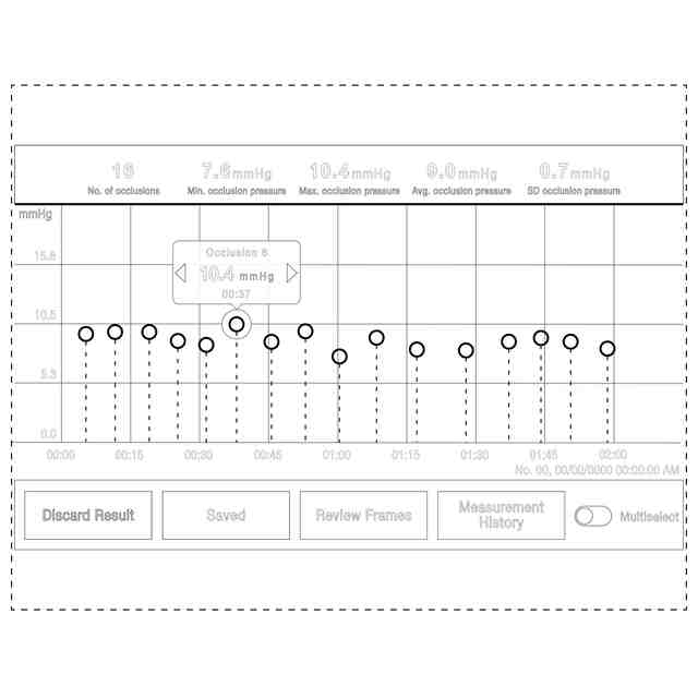 この画像は、血管の超音波検査中にマークを付けた閉塞の詳細を選択して表示するために使用されるものである。使用者が選択した閉塞の位置にマークを付けることにより、当該画像は画像図1から2の順で漸次的に変化する。