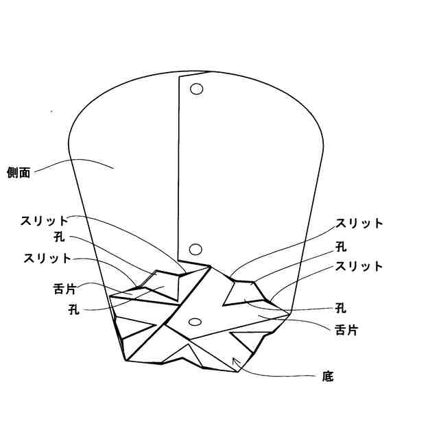 この意匠に係る物品の育苗用ポットは、その内部に植物の苗を植え、その苗を育成するためのものである。展開状態を示す参考図に示す如く、育苗用ポットは一枚の基布からなり、扇状の側面と、その側面の下端にポットの底を形成する台形状の複数の舌片とを有する。その基布は、各舌片と側面との境の中心部にダイヤ型の孔が形成されている。その孔と隣接する舌片の付根の谷の部分へ延長するスリットが形成されている。この基布を、底面から見た参考斜視図及び参考説明底面図に示す如く、舌片を重ね合わせて鉢状に形成する。この育苗用ポットは、平面図及び底面図に示す如く、その底が平面五角形、頂部が平面円形に形成されている。この育苗用ポットは、使用状態を示す参考図に示す如く、成長した植物の根が育苗用ポットに形成された孔及びスリットから突出しやすく、それらの孔及びスリットは突出した根が互いに絡まり難い位置に形成されている。