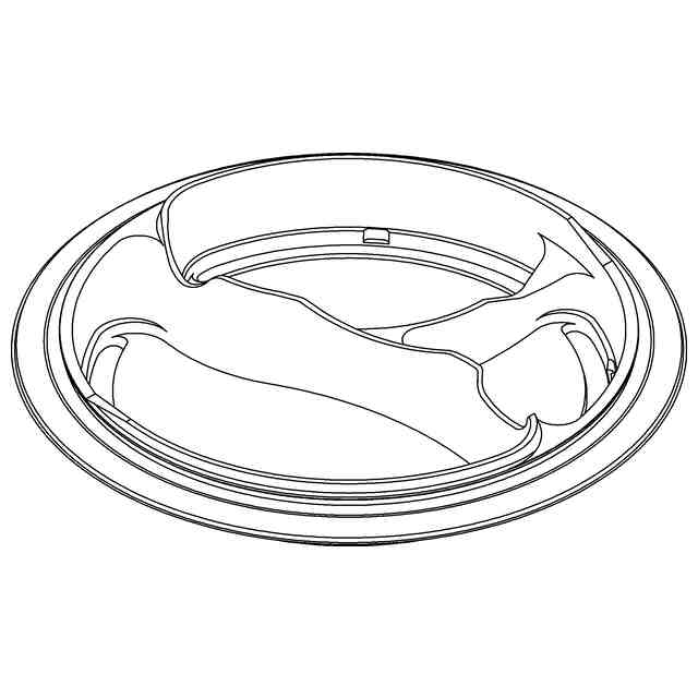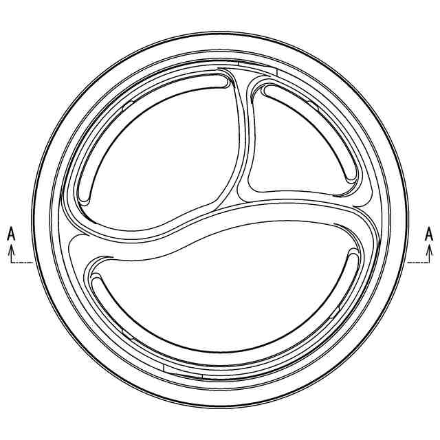 本物品は、食品を包装する合成樹脂製の包装用容器であり、仕切り壁で仕切られた3つの食品収納部を有し、容器の外周には、外側に広がるフランジ部と、蓋を嵌合固定するための凸条を有する。内側の仕切り壁は、A-A線断面図に示す通りその高さは一定ではなく波型となっている。