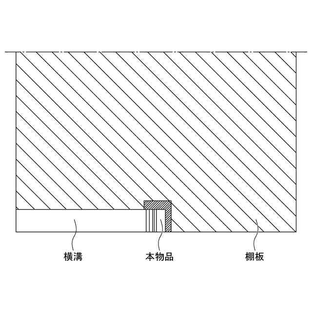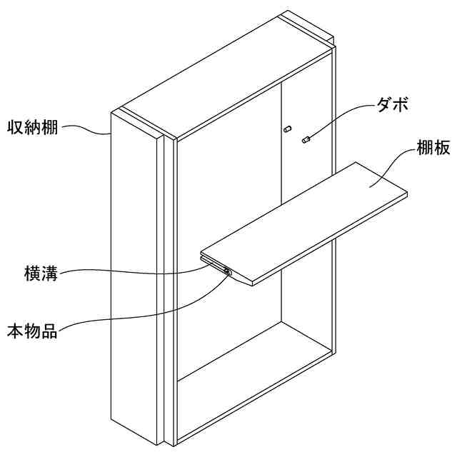 本物品は、棚板に設けられた横溝に装着して使用するものである。棚板の横溝に、収納棚の側壁に取り付けられたダボを挿入し、ダボを本物品に係止させて棚板を固定する。実線で現した部分が意匠登録を受けようとする部分であり、一点鎖線は登録を受けようとする部分とその他の部分との境界のみを示すものである。