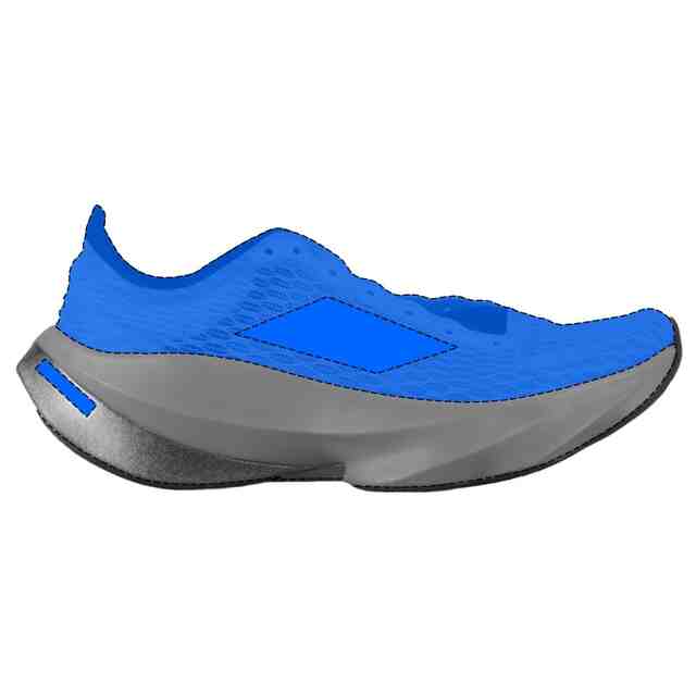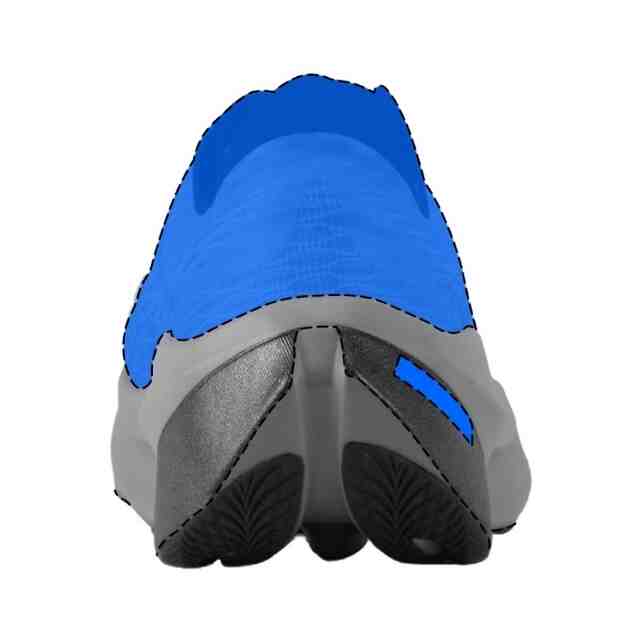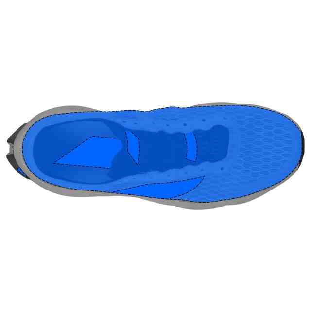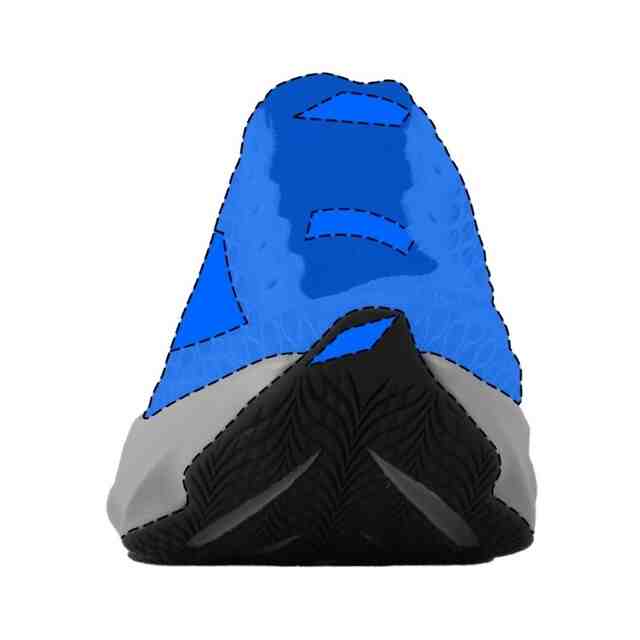 破線で表された部分以外の部分及び青色で着色した部分以外の部分が、意匠登録を受けようとする部分である。ミッドソール部分とアウトソール部分の間に表れる破線は、ミッドソール部分とアウトソール部分の境界を示す線であって、意匠登録を受けようとする部分以外の部分である。各図の表面部全面に表された濃淡は、いずれも立体表面の形状を特定するためのものである。