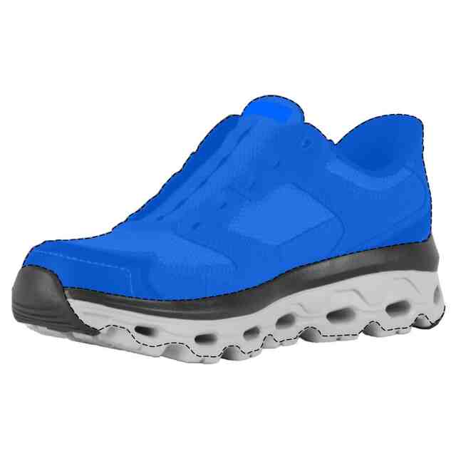 破線で表された部分以外の部分及び破線で囲まれた青色で着色された部分以外の部分が、意匠登録を受けようとする部分である。ミッドソール部分とアウトソール部分の間に表れる破線は、ミッドソール部分とアウトソール部分の境界を示す線であって、意匠登録を受けようとする部分以外の部分である。各図の表面部全面に表された濃淡は、いずれも立体表面の形状を特定するためのものである。