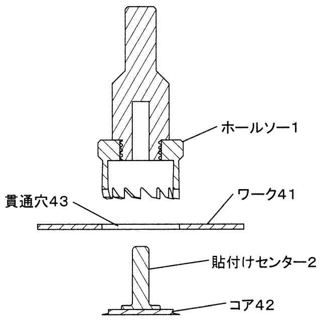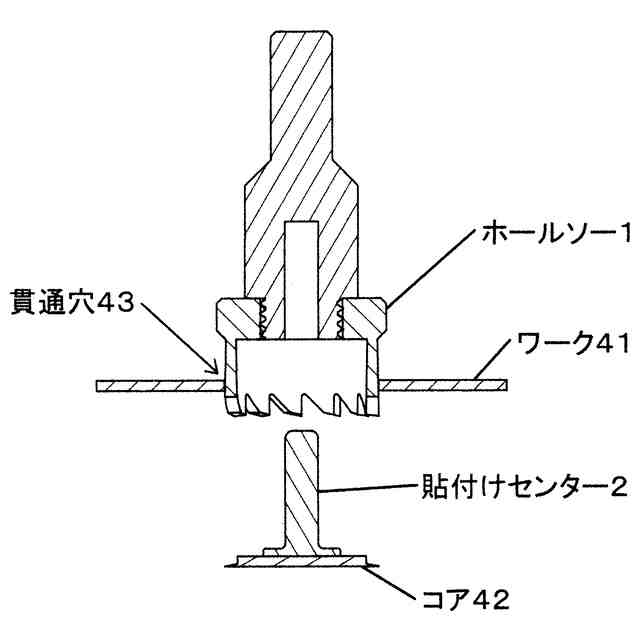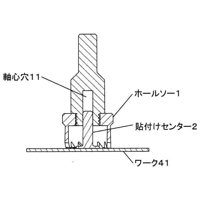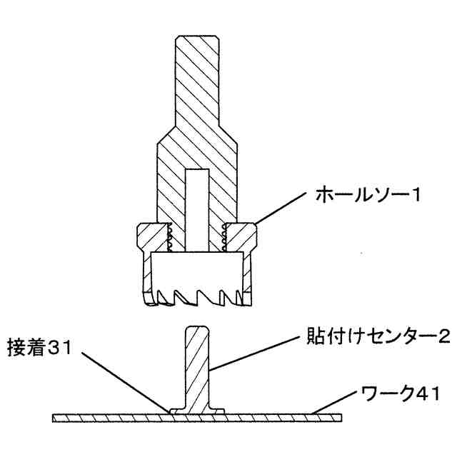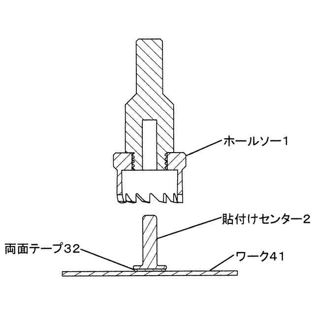本物品は、参考使用中断面図に示すように、板材のような孔開け対象のワーク41に、ホールソーの刃12が直角に当たった状態を維持するための補助具である。 参考使用中断面図に示すように、ホールソーの軸心穴11に孔開け補助棒21が挿入されることで軸心穴11の内壁と補助棒21の外面とが接触した状態で、ホールソーを上下に擦り動かすことができ、ホールソーの刃12がワーク41に直角に当たった状態を維持しながらワーク41に貫通穴43を作成できる。 本物品は、参考使用断面図1で示すようにワーク41と貼付け部22の底面とが接着31(具体的には参考使用断面図2で示すように両面テープ32)され、固定された状態で使用される。