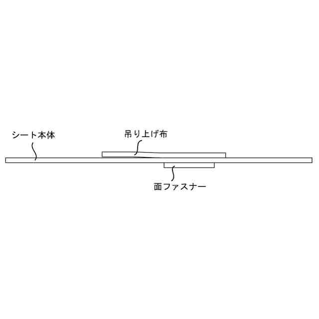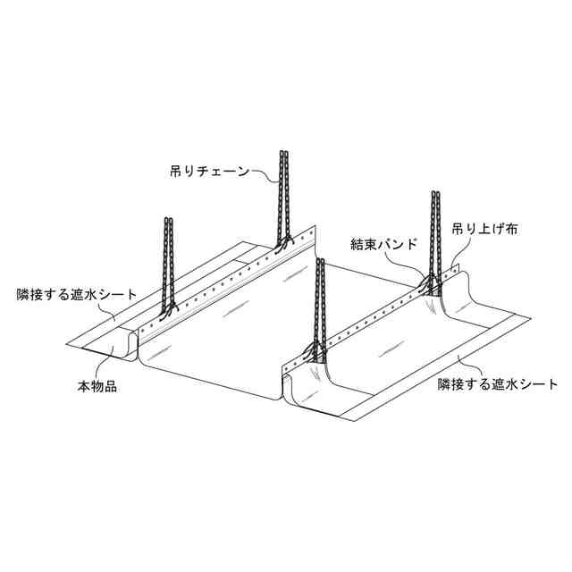 本物品は、吊り足場の漏水対策として使用する遮水シートである。シート本体、吊り上げ布、面ファスナーにより構成される。吊り上げ布に配された孔に結束バンド等の結束材を挿通し、吊り足場の吊りチェーンと連結して使用する。本物品の底面に設けた面ファスナーは、隣接する遮水シートと本物品を接続する際に用いられる。