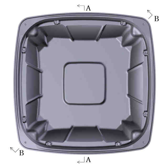 各図面の表面部全面に表された濃淡は、いずれも立体形状を特定するためのものである。A-A断面図及びB-B断面図に表された青色は、断面形状のみを表すものである。