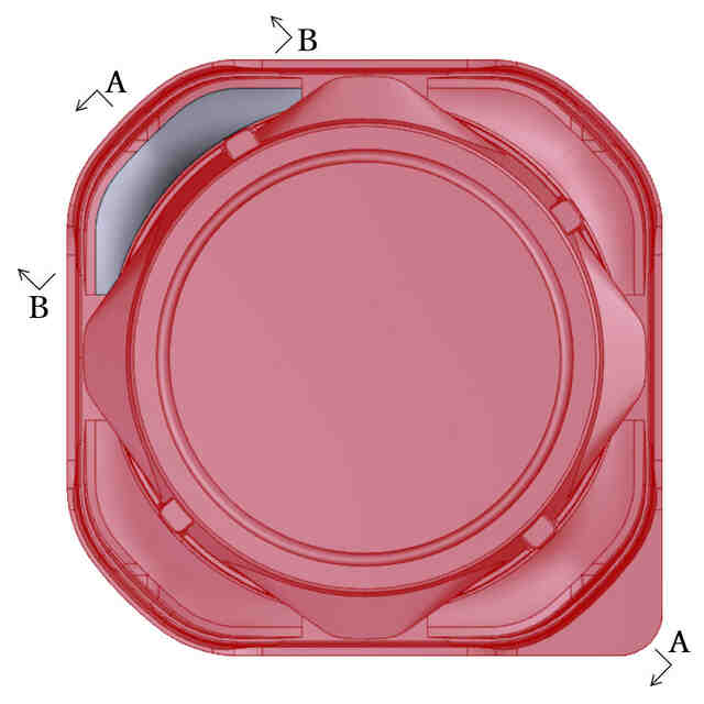 各図面の表面部全面に表された濃淡は、いずれも立体形状を特定するためのものである。部分意匠として意匠登録を受けようとする部分は、赤色で表された部分以外の部分である。A-A断面図及び参考B-B拡大断面図に表された青色は、断面形状のみを表すものである。