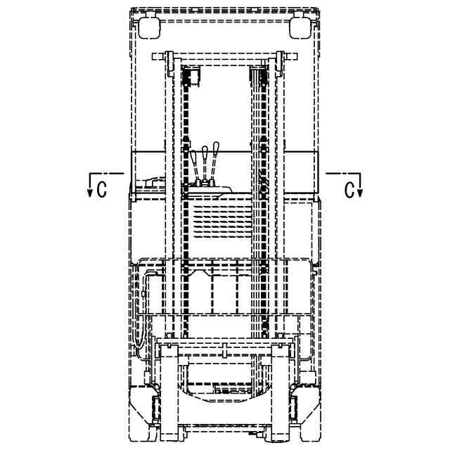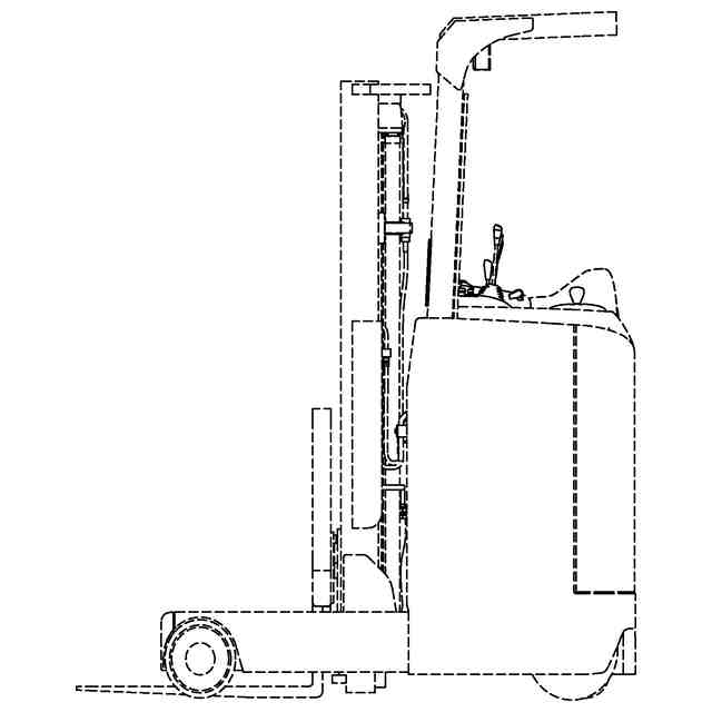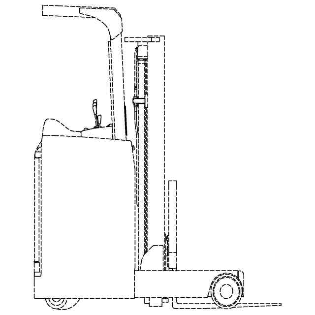 実線で表した部分が、部分意匠として意匠登録を受けようとする部分である。意匠登録を受けようとする部分は、ヘッドガード脚部に取り付けられたディスプレイである。ディスプレイは、プロンプターやプロジェクター等の投影装置からの画像を表示するように構成されている。そして、フォークリフトの運転者が、ディスプレイに表示された画像を確認することができる。ディスプレイに表示される画像は、例えば、フォークリフトの荷役を支援するための案内画像等である。また、ディスプレイは、運転者の視界を遮らないよう透明で構成されている。一部拡大参考斜視図は、意匠登録を受けようとする部分を表すために、マスト、キャリッジ等を省略したものである。