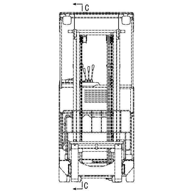 実線で表した部分が、部分意匠として意匠登録を受けようとする部分である。意匠登録を受けようとする部分は、ヘッドガード桟部に取り付けられたディスプレイである。ディスプレイは、プロンプターやプロジェクター等の投影装置からの画像を表示するように構成されている。そして、フォークリフトの運転者が、ディスプレイに表示された画像を確認することができる。ディスプレイに表示される画像は、例えば、フォークリフトの荷役を支援するための案内画像等である。また、ディスプレイは、運転者の視界を遮らないよう透明で構成されている。一部拡大参考斜視図は、意匠登録を受けようとする部分を表すために、マスト、キャリッジ等を省略したものである。