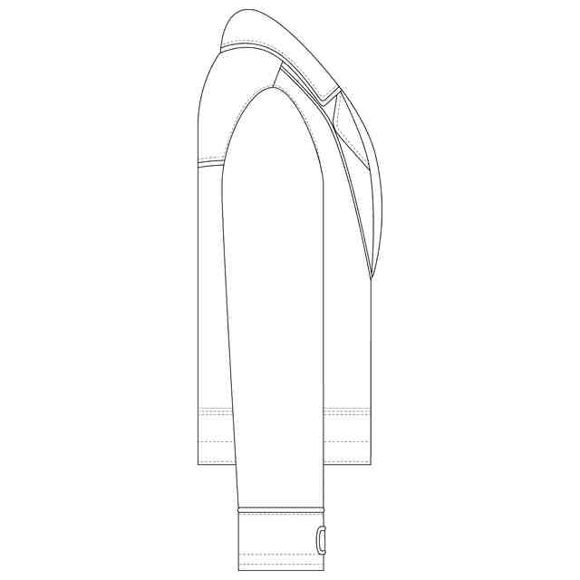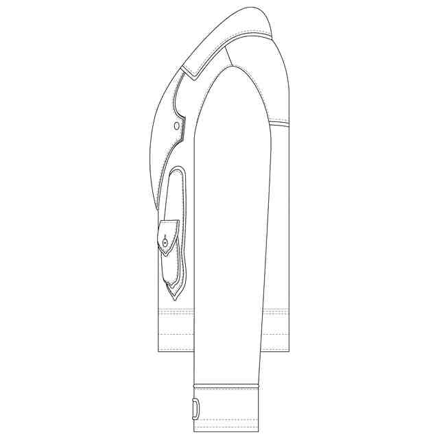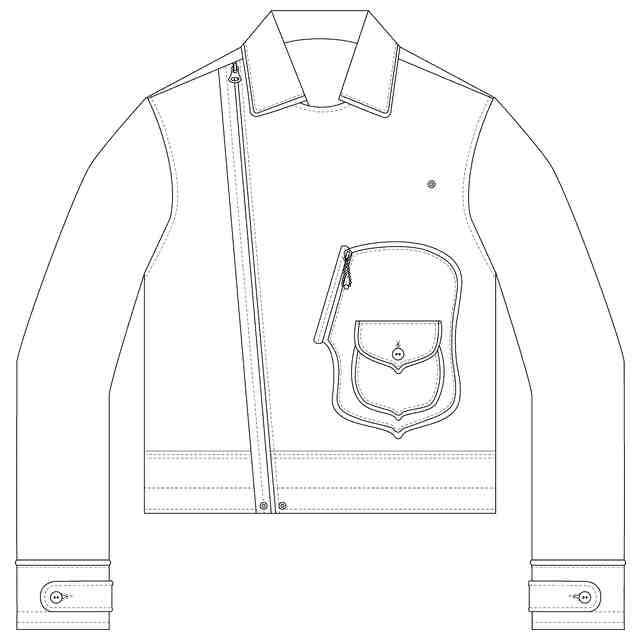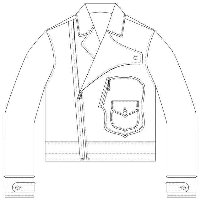 本物品は、ライダースジャケットタイプのジャケットである。「参考正面図」に示すように、左右の前身頃をファスナーで開閉することができる。着用者から見て左側の下襟は、比較的大きく形成されており、スナップボタンで左前身頃に保持される。そのスナップボタンを外して、ファスナーを上まで上げると、「ファスナーを上まで上げた状態の正面図」に示すような状態とできる。左前身頃には、ファスナーで開閉される比較的大きなポケットと、フラップ付きの比較的小さなポケットとが設けられている。