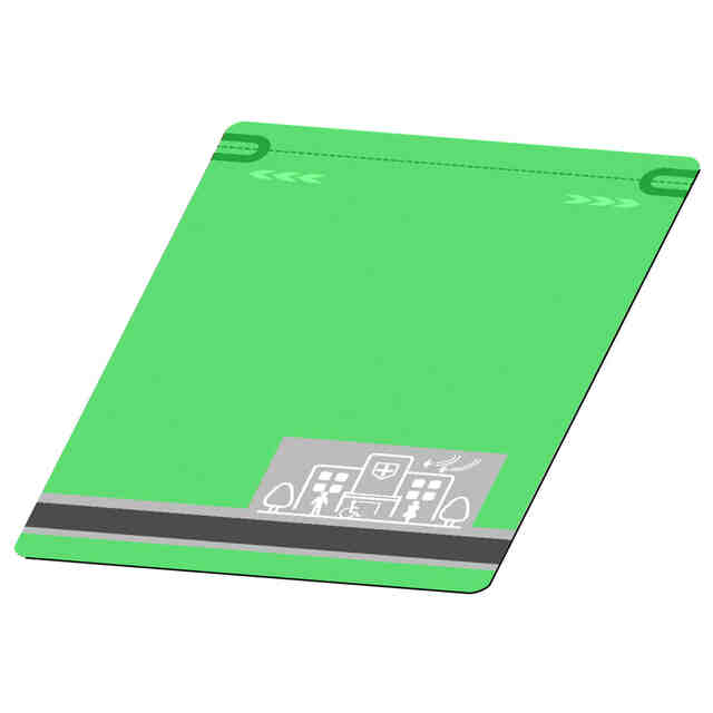 本物品は、医療用パップ剤等を収容して販売するための包装用袋で、表裏2枚のシート材の周囲をシールしてできる内部空間にパップ剤が収容される。この袋は、袋上端縁の近傍を破ることで開封され、破り開けられる箇所のやや下方、袋内側には、再封用のチャックが設けられている。袋の寸法は、タテ20.5cm×ヨコ15cmである。