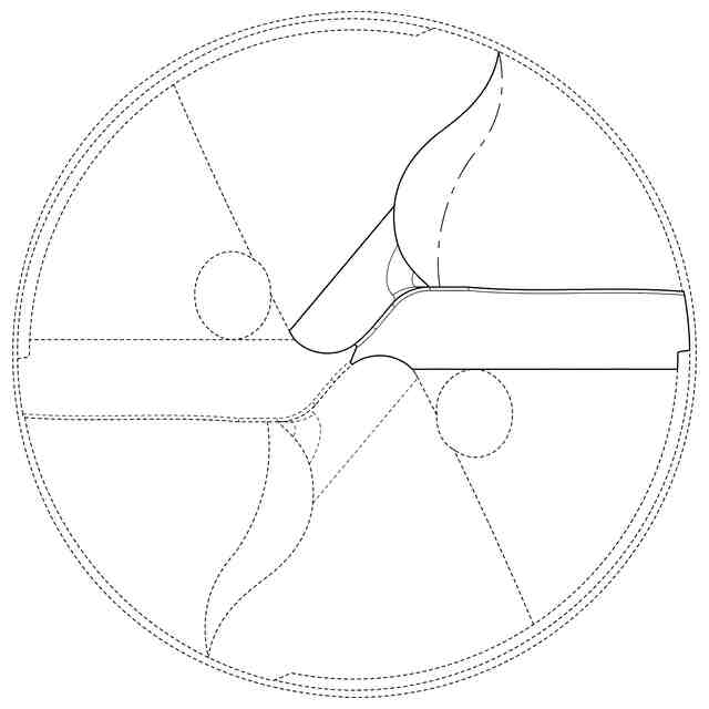 破線で表した部分を除き、実線で表した部分が登録を受けようとする部分である。一点鎖線は、意匠登録を受けようとする部分とその他の部分との境界のみを示す線である。E-E部分拡大図およびF-F部分拡大図の各々において実線および一点鎖線で囲まれた領域に表わされた細線は、いずれも立体表面の形状を特定するためのものである。
