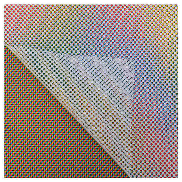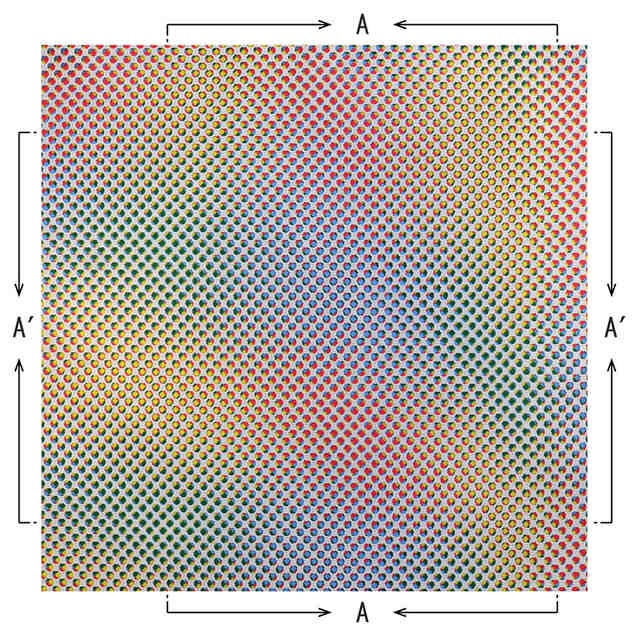 本物品は、プリント生地とメッシュ生地とを重ね合わせてなるもので、プリント生地の模様とメッシュ生地の孔との重なりの変化に応じてグラデーション模様が変化して現れる。A-A´部の変化した状態の拡大図及びA-A´部の他の変化した状態の拡大図は、メッシュ生地が回転方向にずれたときの状態を示す。A-A´部の他の変化した状態の拡大図2は、メッシュ生地に波状にしわができたときの状態を示す。
