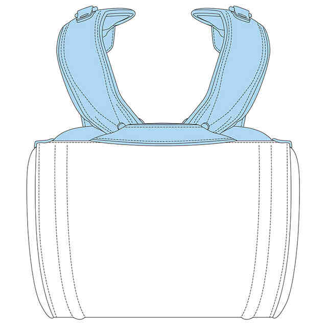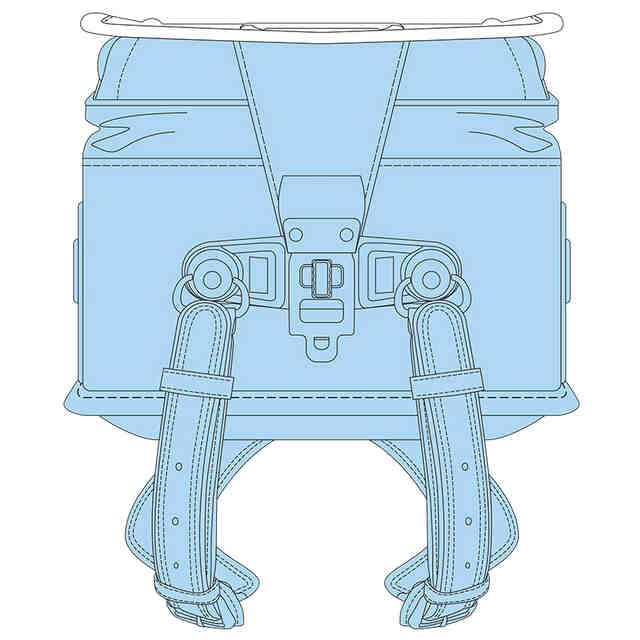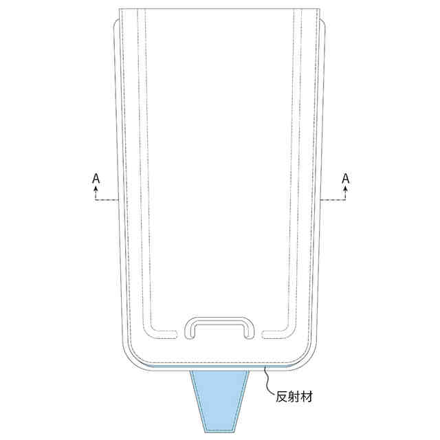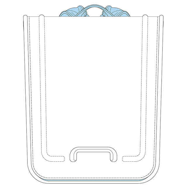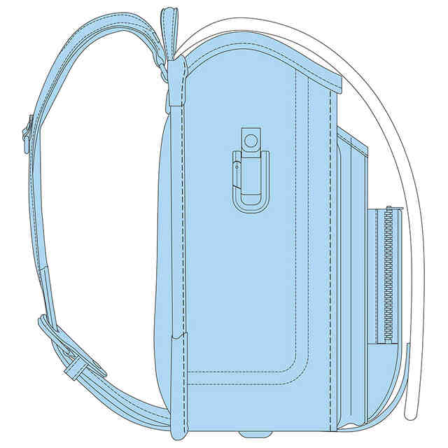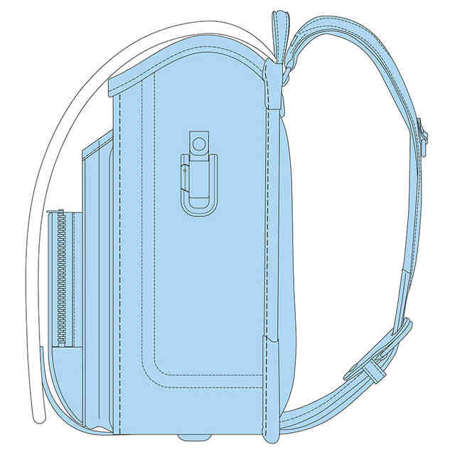 青色に着色された部分以外の部分が、部分意匠として意匠登録を受けようとする部分である。当該部分はランドセルのカブセ部であり、内側の破線はステッチである。