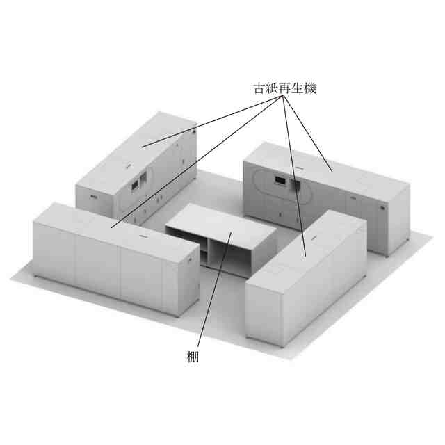 この古紙再生作業室は、例えばオフィス内に設けられ、4台の古紙再生機と棚が設置されている。古紙再生機は、使用済みの用紙等を新たな用紙に再生させるものである。なお、この古紙再生作業室は、オフィスに限定されるものではない。