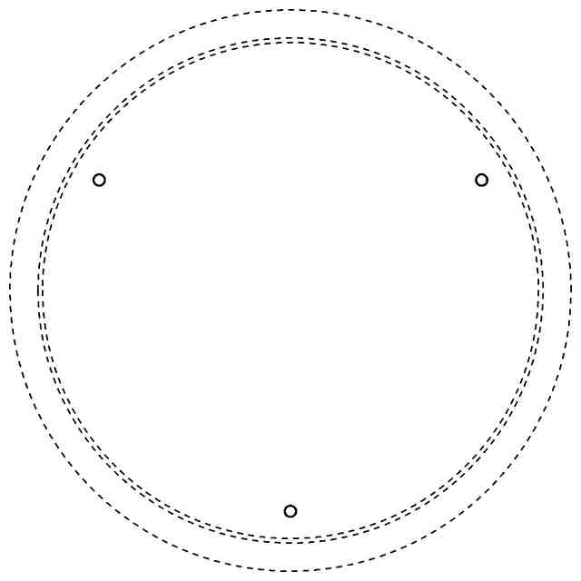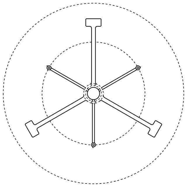 実線で示した部分が部分意匠として登録を受けようとする部分である。「上方斜視図」および「下方斜視図」は、半導体製造用ウエハ用支持具の外観を斜め方向から見た様子を示す。「A-A線近傍の拡大図1」と「A-A線近傍の拡大図2」は右側面図における部分拡大図であり、「A-A線近傍の拡大図1」はサポートアームの上昇時を示し、「A-A線近傍の拡大図2」はサポートアームの降下時でありリフトピンがサセプタから突出している状態を示す。