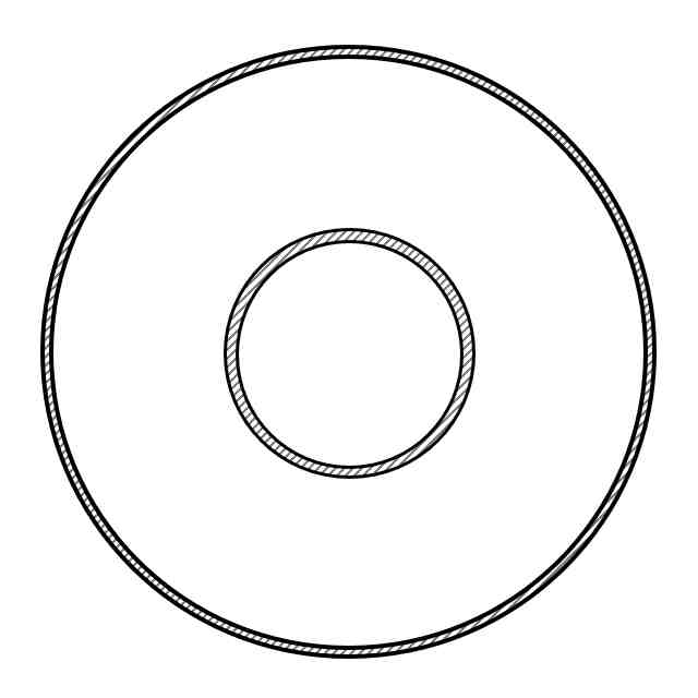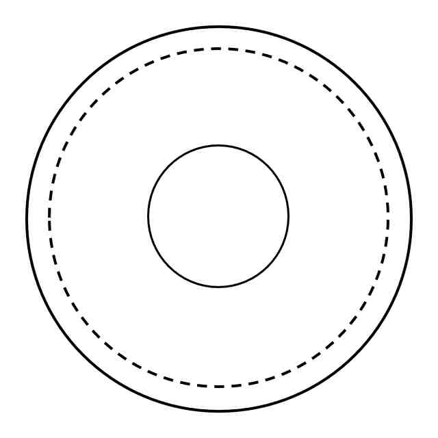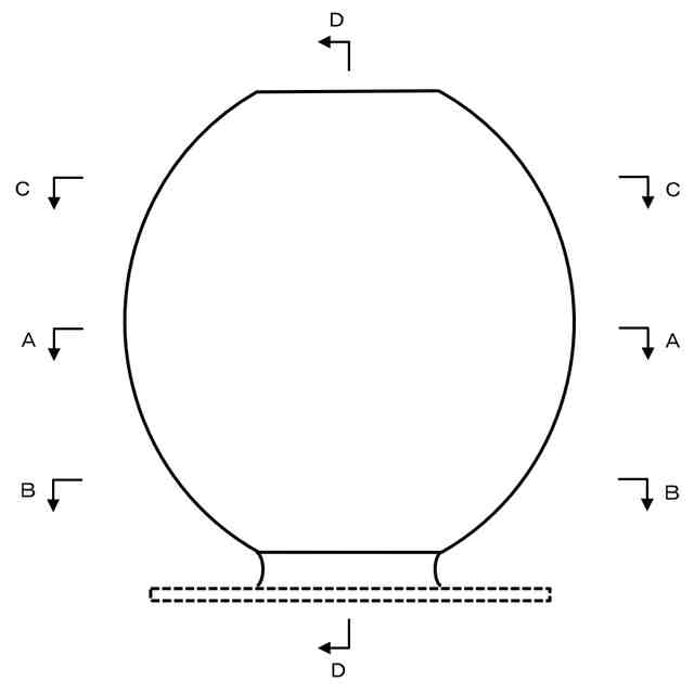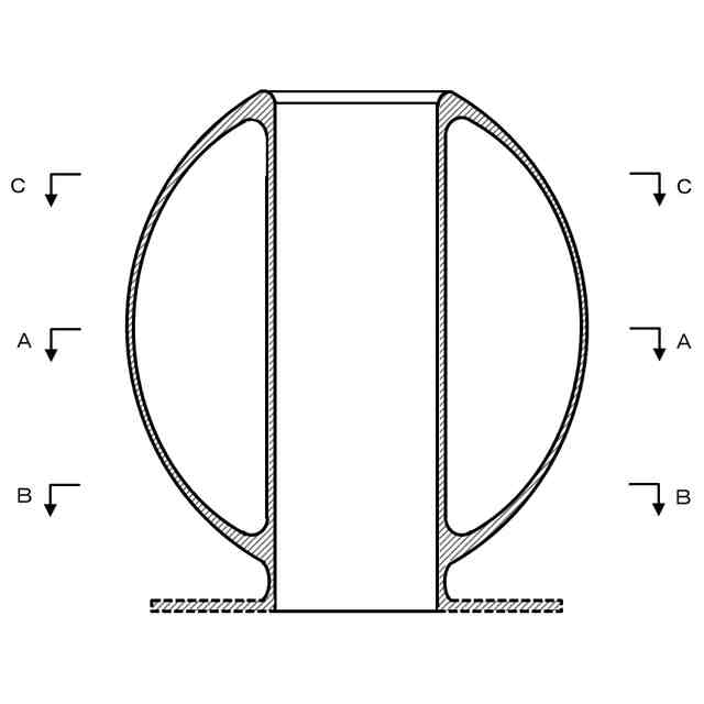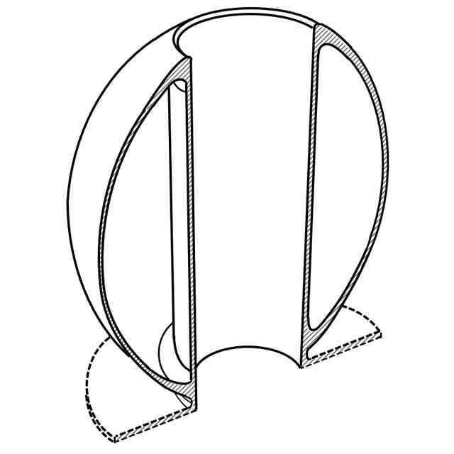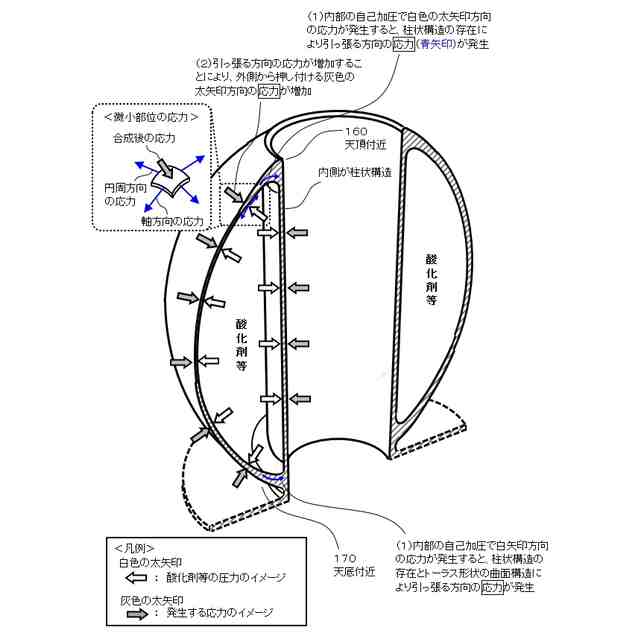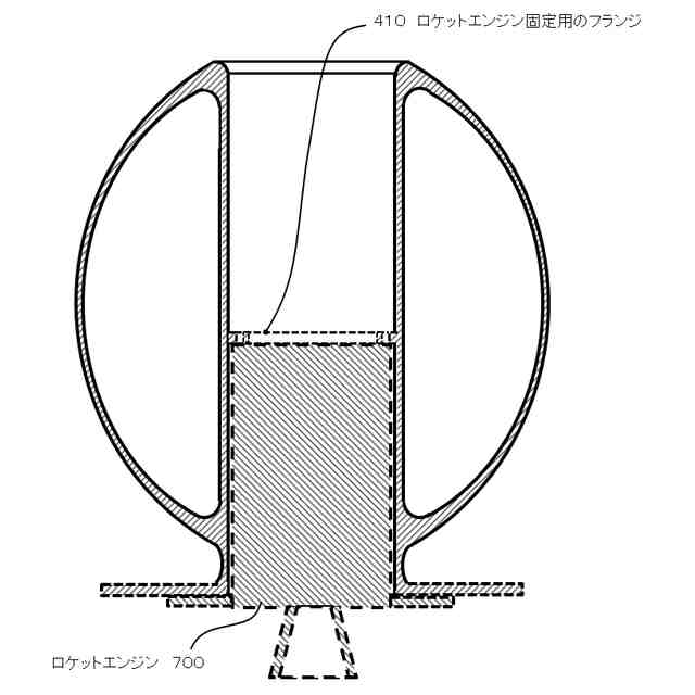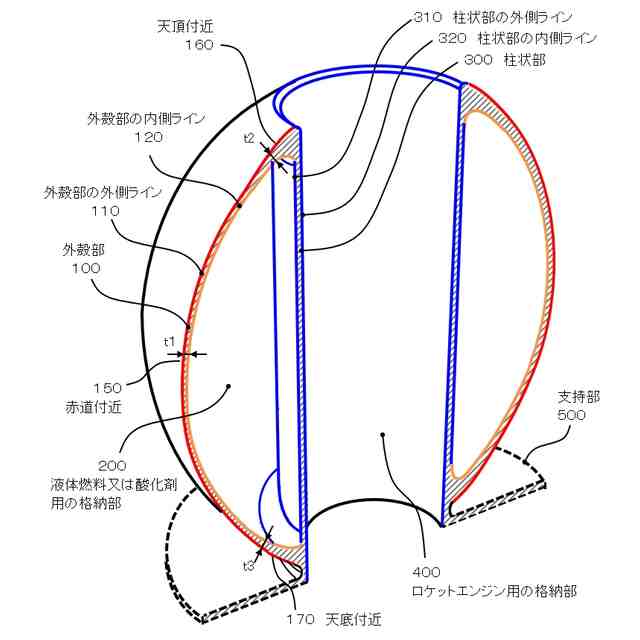 実線で表した部分が、部分意匠として意匠登録を受けようとする部分である。 なお、C-C断面図は、B-B断面図と同じであるため省略する。 参考図1は、D-D断面斜視図をベースに、本願意匠の概略構成を示した参考図である。 参考図2は、D-D断面斜視図をベースに、ロケットエンジンと組み合わせた場合の一例を示す参考図である。 参考図3は、D-D断面図をベースに、ロケットエンジンと組み合わせた場合の一例を示す参考図である。 参考図4は、D-D断面斜視図をベースに、酸化剤又は燃料の注入用のインレットないし、酸化剤又は燃料をロケットエンジンへ供給するためのアウトレットを設けた場合の一例を示す参考図である。 参考図5は、本創作の外殻トーラス柱状構造のタンクにおける、内部の酸化剤等の自己加圧による応力の発生の概念図である。 参考図1に示すように、一般的な球状のタンクとは異なり、タンクの内側に略円柱状の構造体として柱状部300(青色の部位)を設けたことにより、柱状部300と外殻部100とで連続した形状を構成し、外殻部100の厚みを薄くして全体を軽量化しても、液体燃料又は酸化剤の圧力に耐える強度を確保することが可能となる。 より具体的には、外殻部の外側のライン110(赤色のライン)と柱状部の内側のライン310(青色のライン)、及び、外殻部の内側ライン120(朱色のライン)と柱状部の外側ライン320(青色のライン)とが、連続したラインを構成し、全体として、外側がトーラス状で、内側が柱状の構造である、外殻トーラス柱状構造を形成することにより、外殻部100の赤道付近150の厚み(t1)を薄くしても、液体燃料又は酸化剤の圧力に耐える強度を確保することが可能となる。 また、参考図2、参考図3に示すように、柱状部300の内側の空洞部には、ロケットエンジン用の格納部400を構成して、ロケットエンジン700を格納することができる。その際、タンクの内側にロケットエンジン固定用のフランジ410を設けて、ロケットエンジン700をボルト等で固定することができる。 このため、タンクを支持するための構造を別途設ける必要がなくなるので、前記の外殻部の厚みを薄くできることと相まって、タンク全体の重量を軽量化することに貢献する。 なお、参考図4に示すように、外殻部100ないし柱状部300の一部には液体燃料又は酸化剤の注入用のインレットないし、ロケットエンジンへ供給するためのアウトレットを設けることができる。 また、参考図5に示すように、(1)内部の自己加圧で白色矢印方向の応力が発生すると、柱状構造の存在により、天頂付近160及び天底付近170を起点として、赤道付近150に至るまで、引っ張る方向の応力が発生し(青色矢印)、これに伴って、(2)引っ張る方向の応力が増加することにより、外側から押し付ける灰色の太矢印方向の応力が増加する構造になっている。 また、参考図5の左側の外殻の一部を拡大した図(点線で囲んだ図)に、外殻の微小部位に発生する応力の詳細を示した。拡大図によれば、天頂付近160及び天底付近170を起点として発生した引っ張る方向の応力によって、単なる球形状等で内側に柱状部がない構造と比較して、微小部位の周囲に円周方向にやや湾曲した方向の応力(青色矢印)が増加するので、張力を合成した応力(灰色の太矢印)も大きくなることがわかる。このため、単なる球形状で内側に柱状部がない構造に対し、外殻の厚みを薄くしても強度を確保することが可能となる。