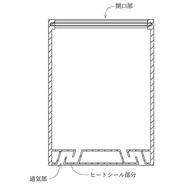 本物品は、衣類等を本物品の袋体の中に入れて密閉した後、袋体を押さえて中の空気を排出することによって減容することができる袋体である。2枚合成樹脂製シートが積層され、所定部位がヒートシール(熱融着)されて逆止弁構造の通気部が形成されている。ヒートシール部分は〔参考図〕において斜線で示した部分である。圧縮袋の縦の長さは50cm、横の長さは35cmである