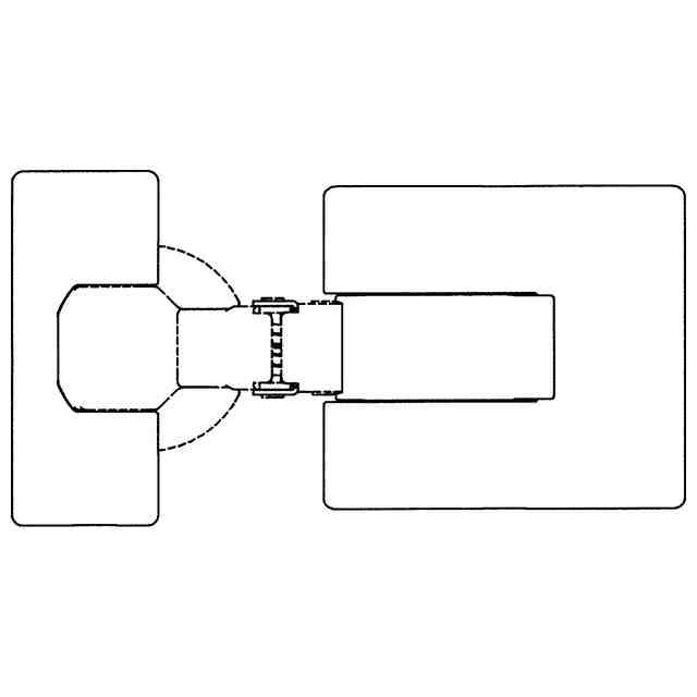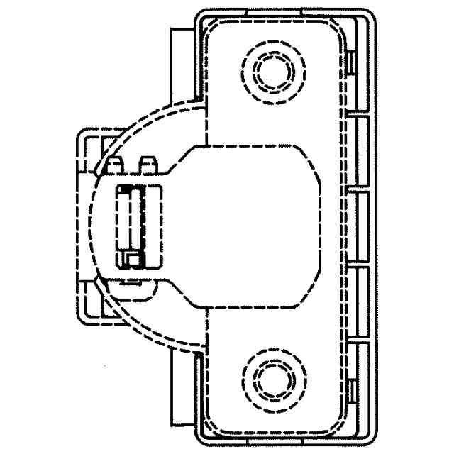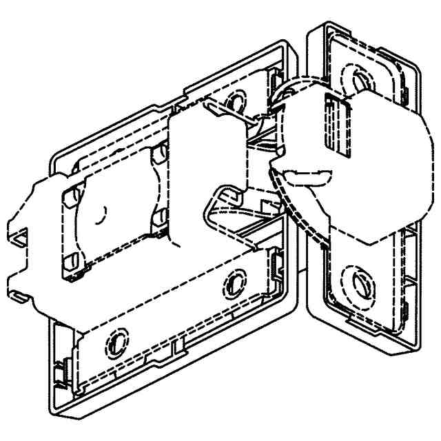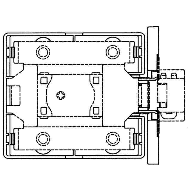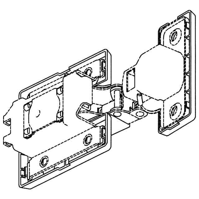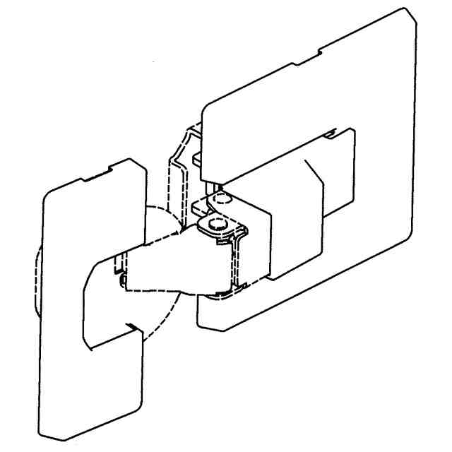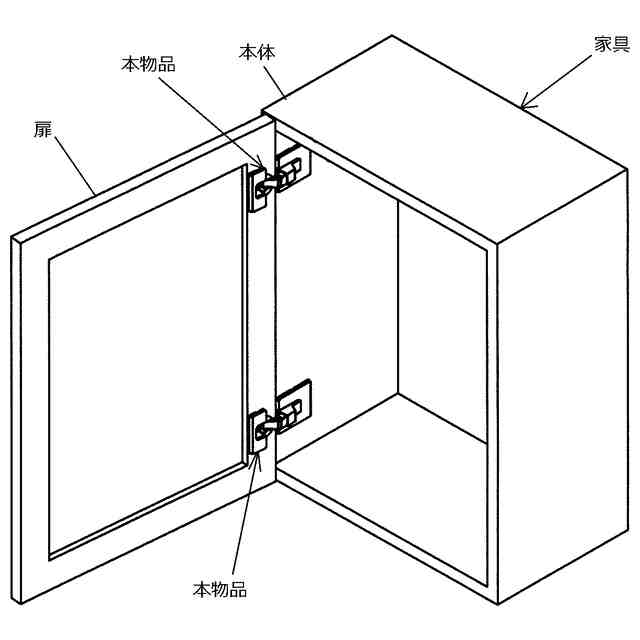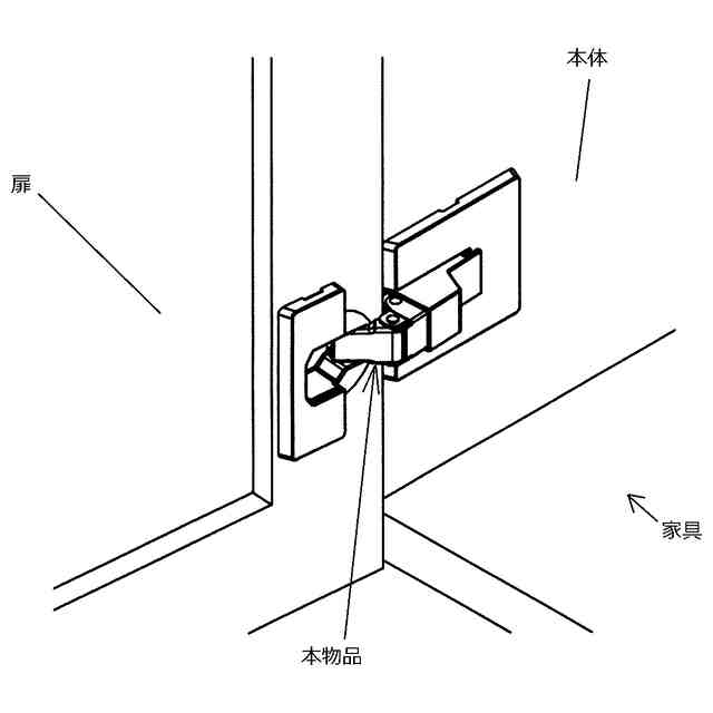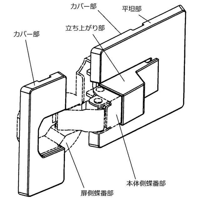本物品は、家具や機械装置の扉を、家具や機械装置の本体に対して開閉可能に連結するものである。本物品は、蝶番部(扉側蝶番部・本体側蝶番部)と、蝶番部を覆うカバー部と、で構成されている。カバー部は、扉側蝶番部を覆うカバー部と、本体側蝶番部を覆うカバー部(平坦部と立ち上り部の2部品で構成)と、で構成されている(正面側から見た参考斜視図を参照)。使用状態を示す参考図1は、本物品を家具に使用し、扉が開いた状態をあらわしている。使用状態を示す参考図2は、使用状態を示す参考図1における2つの本物品のうち、下側の本物品の取付け箇所を拡大した図である。本物品は、扉と本体の取付面に設けられた堀込穴に、蝶番部が埋め込まれるようにして取り付けられる。