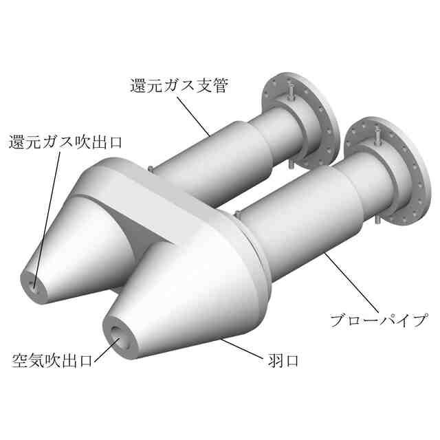 本物品は、高炉内に空気及び還元ガスを送り込むための交換部材であり、「取付状態の断面参考図」のように、本物品の先端の空気吹出口及び還元ガス吹出口が高炉内部に位置するように設置される。