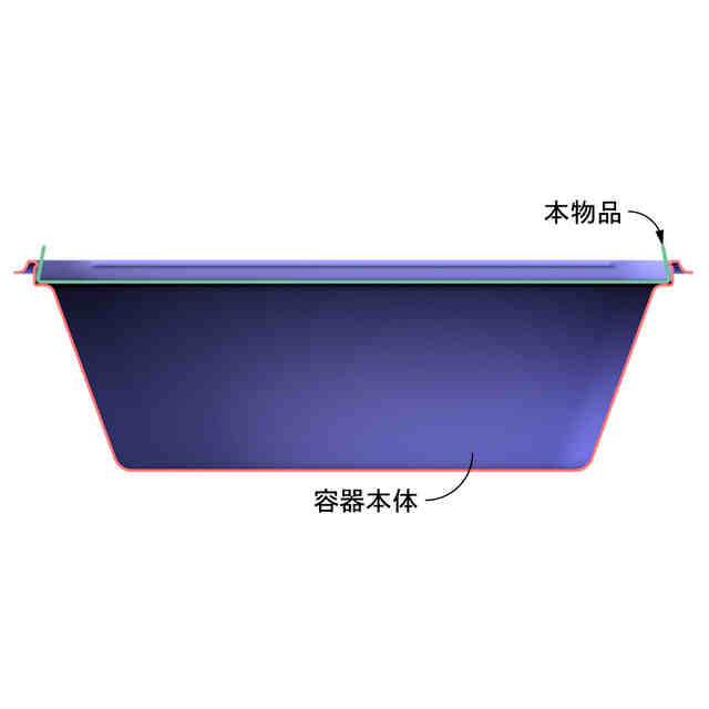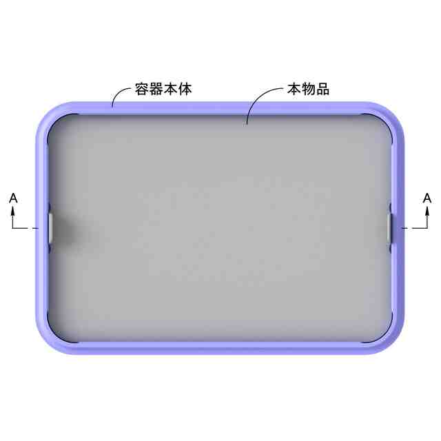 背面図は正面図と、右側面図は左側面図と、底面図は平面図とそれぞれ対称にあらわれるため、省略した。各図面の表面部全面に表された濃淡は、いずれも立体形状を特定するためのものであって、意匠を構成するものではない。なお、「使用状態を示す参考平面図」、「使用状態を示す参考斜視図」、「使用状態を示す参考A-A断面図」において青色で着色された部分、及び、「使用状態を示す参考A-A断面図」において赤色で着色した部分は、意匠登録を受けようとする物品ではない。「使用状態を示す参考A-A断面図」においては、緑色で着色し、「本物品」として示したものが、意匠登録を受けようとする物品に関する断面図である。