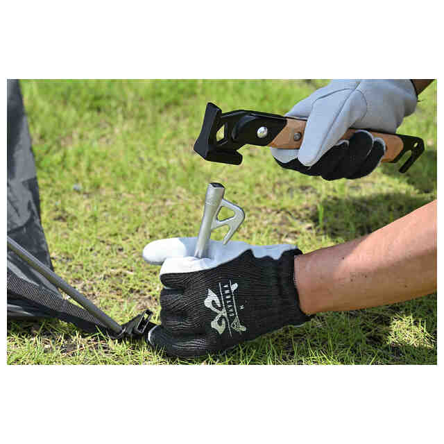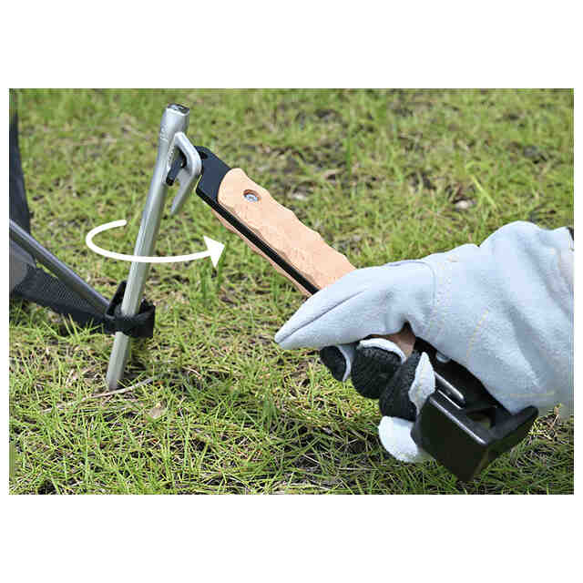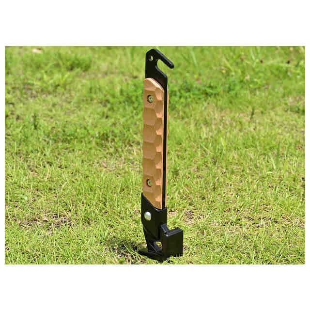 本願意匠に係る物品であるキャンプ用ハンマーは、キャンプ用テントやタープの固定用ロープを引っ掛けるペグを打ち込むためのハンマーであって、打面を具えた頭部は、ハンマーが直立定置できるように載置平面を具える。また頭部(打撃部)と反対側の端部には、かぎ状のペグ抜き部を具える。このペグ抜き部は、かぎ部でペグの頭部を引っ掛けて倒伏させるように付勢しながら、ペグの長手方向軸線を中心に回転させることで、ペグの打ち込み状態を解除する。