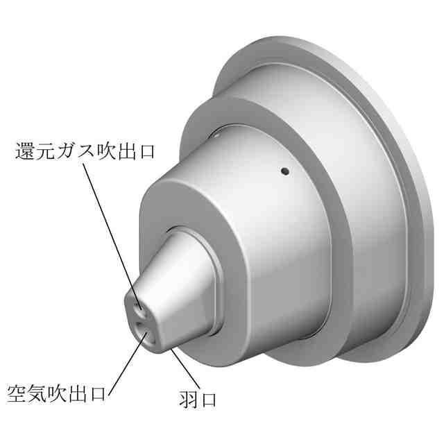 本物品は、高炉内に空気及び還元ガスを送り込むための羽口であり、「取付状態の断面参考図」のようにブローパイプ及び還元ガス支管と接続して用いる交換部材である。