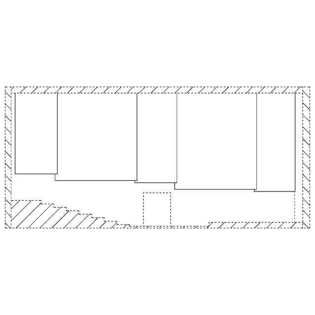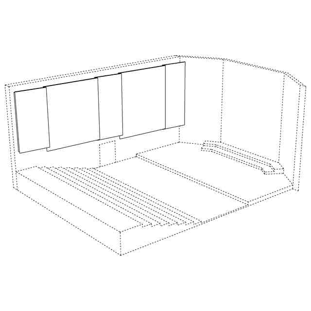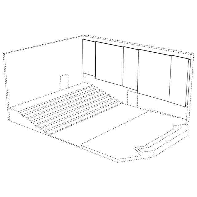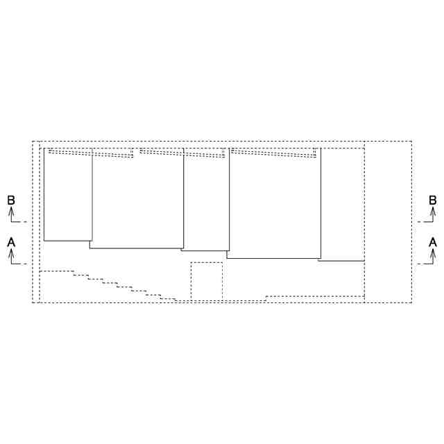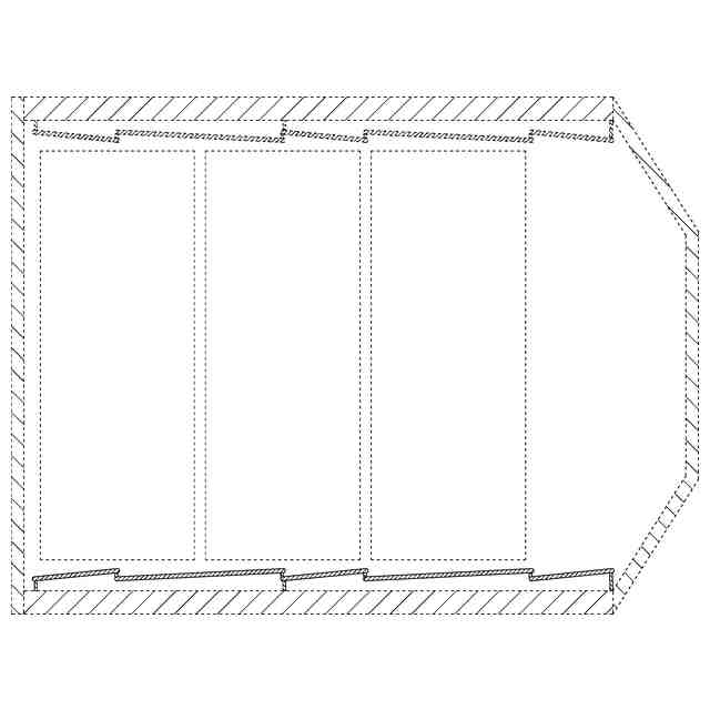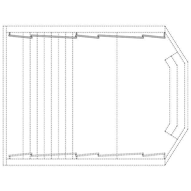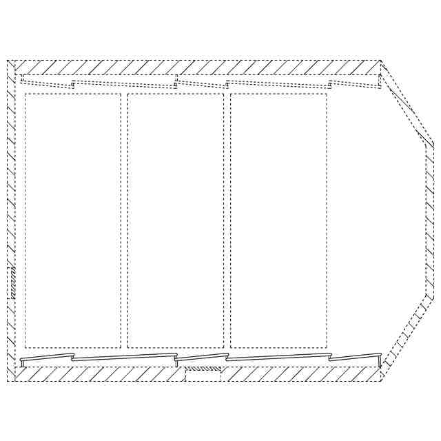 本願意匠は、音楽ホールの内装である。実線で表した部分は、図面中背面側に表された壁に複数枚連続する反射板であり、音が客席に対して均等に降り注ぐような音響空間の実現を目的として設置されている。