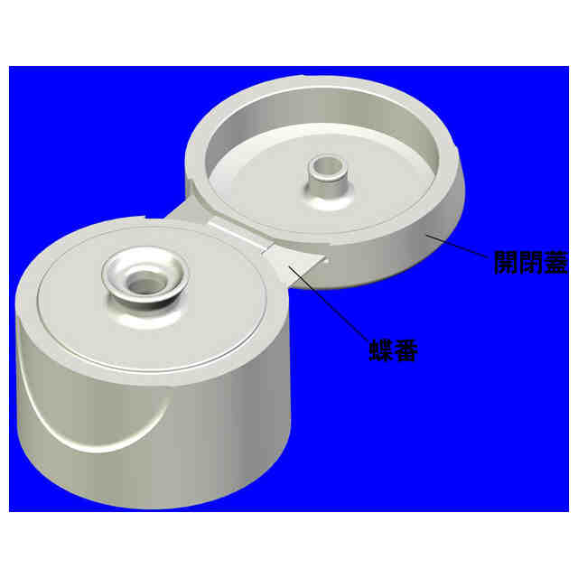 本物品は、包装用容器の口部に取り付けられる包装用容器のキャップである。開放状態を示す参考図に示すように、本物品は、蝶番式の開閉蓋を備える。