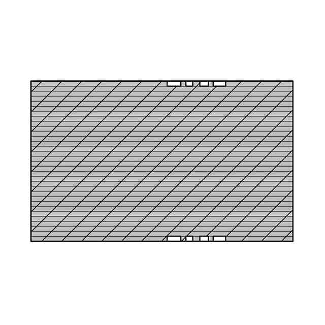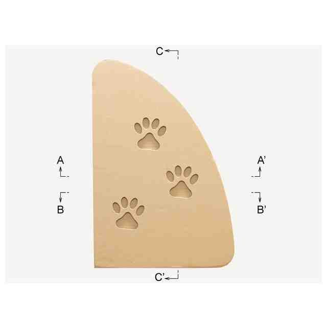 各参考図において、ダンボールの表裏面の色彩は省略し、積層面の領域はグレーで示す。正面図と背面図とにそれぞれ三個ずつ現れている小動物の足跡模様は、本物品の表面と背面とを貫く共通の水平投影面上に配置される対称性を有している。これらの合計六個の小動物の足跡模様は、いずれの足跡模様のいずれの箇所においても同じ深さを有している。足跡模様の深さは、A-A´線参考断面図、B-B´線参考断面図、及びC-C´線参考断面図に示す通りである。