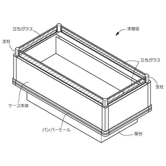 本物品は、平型のオープンショーケースである。オープンショーケースは、上面が開口する四角箱状のケース本体と、ケース本体の下側に配され同ケースを支持する架台と、四隅に支柱を有する四角枠状に構成され、ケース本体の上縁に立設される立ちガラスとを備えている。ケース本体の下部には、バンパーモールが周回状に装着されており、このバンパーモールでケース本体を保護している。
