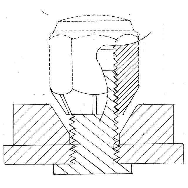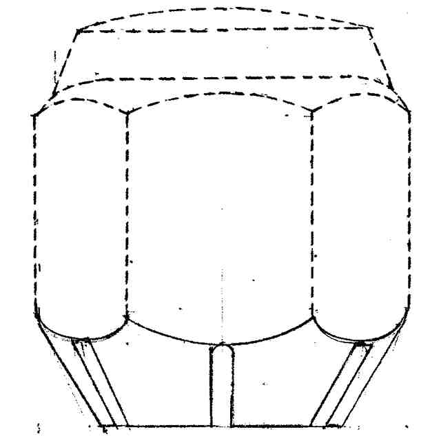 本物品は、自動車タイヤのホイールナットで、緩みによる脱落を防止するためのもので、先端に切込みを設けていて、ホイールナットを螺合するとホイールのテーパーに先端が縮径しチャックのようにボルトに食い込み、緩み難くなるものである。