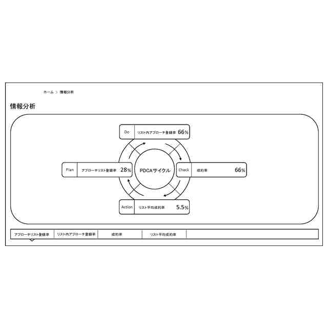 この意匠に係る画像は、情報表示端末に表示される画像であって、目的遂行案件に関し、PDCAサイクルの各サイクルに分類されたタスクごとの達成状況を表示するためのものである。 「画像図」においては、Plan(計画)、Do(実行)、Check(評価)、及びAction(改善)の4エリアを有するPDCAサイクル円、並びに、各サイクルの順序方向を示す矢印が表示される。 またPlan(計画)、Do(実行)、Check(評価)、及びAction(改善)の各エリアには、エリアごとに対応付けられたそれぞれのタスクの達成状況を示す値(例えば%)が集計されて表示される。 「画像図」によれば、利用者(管理者や担当者等)は、PDCAサイクルにおける各サイクルの観点から、達成すべきタスクの達成状況を示す値を、一目で把握することが可能である。 例えば「実施例参考図」に示すように、まず利用者はPlanに分類されて対応付けられたタスクとして「アプローチリスト登録率」の向上を計画立案活動と位置付けて、その達成状況(28%)把握するとともに、今後当該率の向上に努める。またDoに分類されて対応付けられたタスクとして「リスト内アプローチ登録率」の向上を実行活動と位置付けて、その達成状況(66%)を把握するとともに、今後当該率の向上に努める。またCheckに分類されて対応付けられたタスクとして「成約率」の向上を評価活動と位置付けて、その達成状況(66%)を把握するとともに、今後当該率の向上に努める。またActionに分類されて対応付けられたタスクとして「リスト平均成約率」の向上を改善活動と位置付けて、その達成状況(5.5%)を把握するとともに、今後当該率の向上に努める。