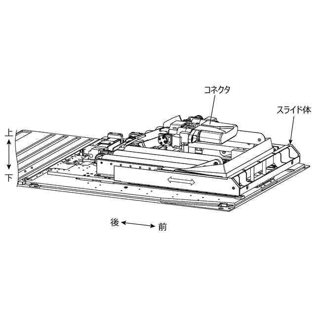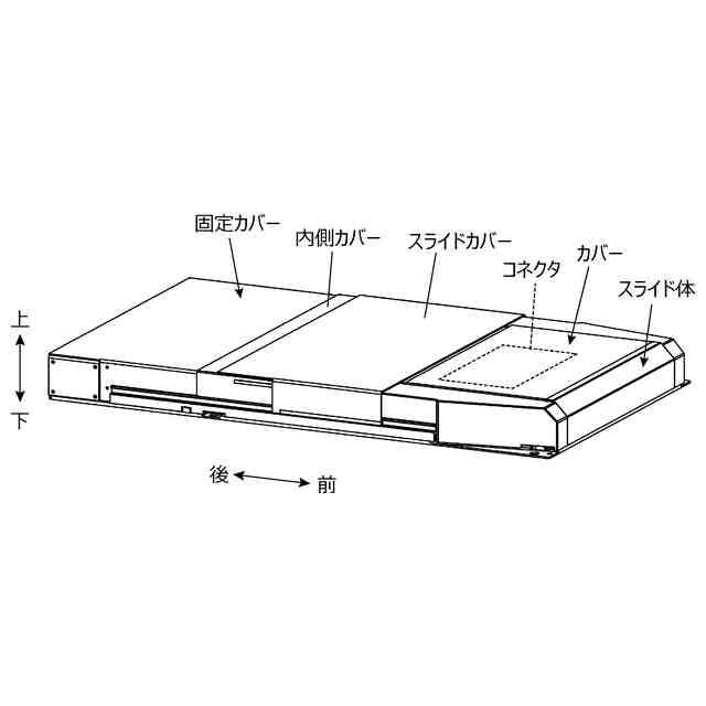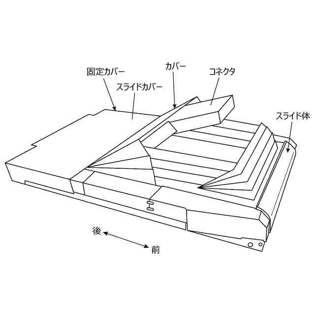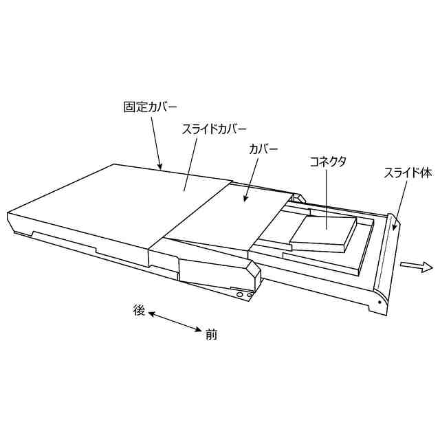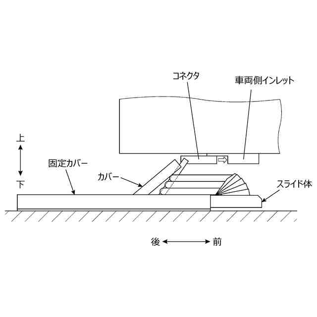 本物品は、車両用充電ユニットのコネクタ機器であって、車両側インレットに嵌合可能なコネクタを内蔵している。参考図に示すように、コネクタは、スライド体に接続されカバーに覆われており、スライド体を前方に移動すると、コネクタがカバー外に露出し、カバーが斜め上方向に持ちあげられることに連動してコネクタが上方に移動し前後方向に移動可能となる。カバーはスライドカバーに対して揺動可能に連結され、スライド体が進退する際にカバー及びスライドカバーがスライド体と共に進退する。また、内側カバーは固定カバーとスライドカバーのひっかけの範囲内で自由に動くようになっていて、カバーが前進後退しても、開口部をなくしかつ機器からはみ出ない。
