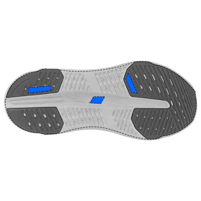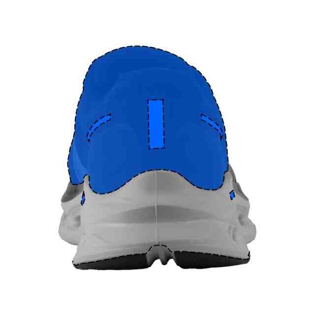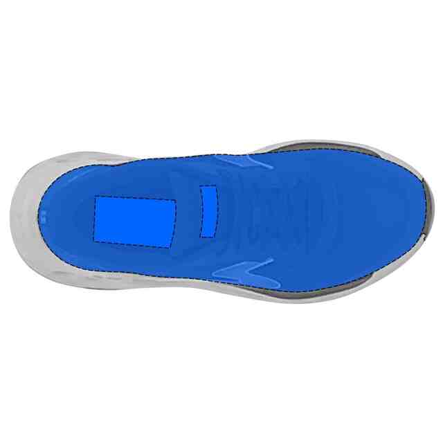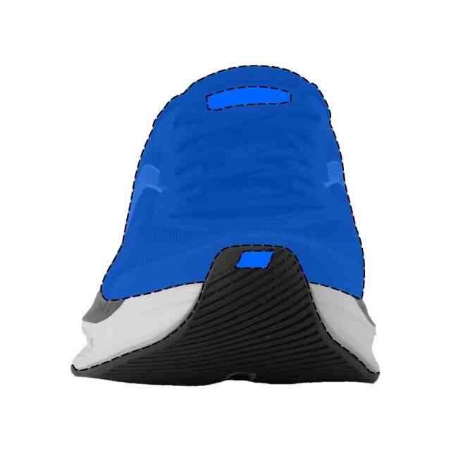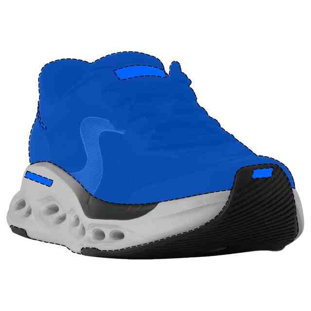 破線で表された部分以外の部分及び破線で囲まれた青色で着色した部分以外の部分が、意匠登録を受けようとする部分である。ミッドソール部分とアウトソール部分の間に表れる破線は、ミッドソール部分とアウトソール部分の境界を示す線であって、意匠登録を受けようとする部分以外の部分である。各図の表面部全面に表された濃淡は、いずれも立体表面の形状を特定するためのものである。