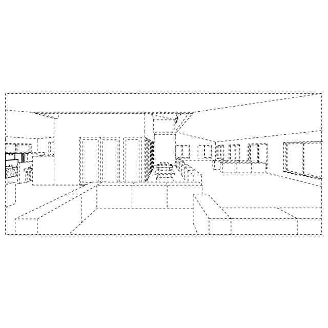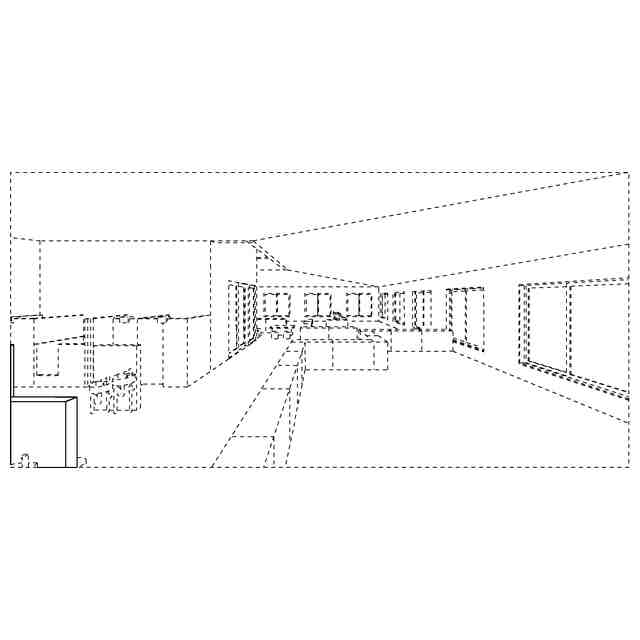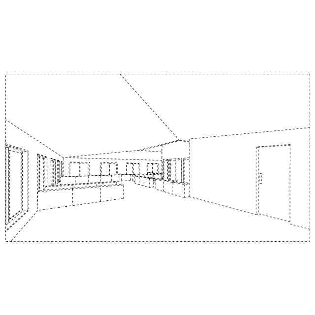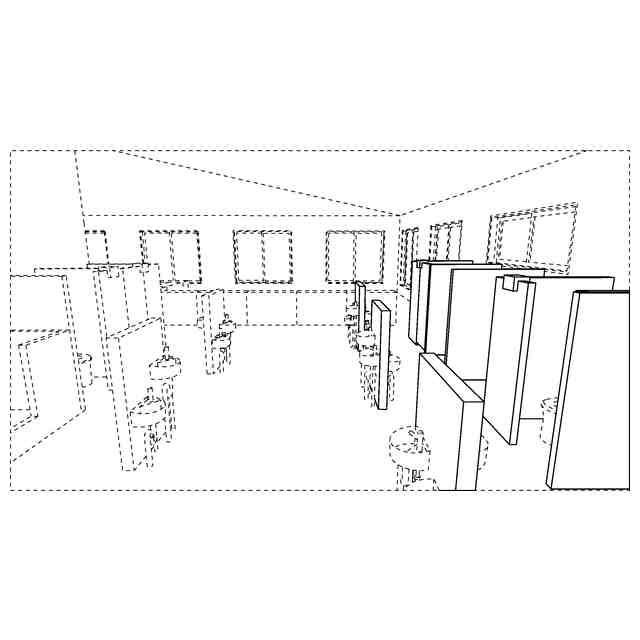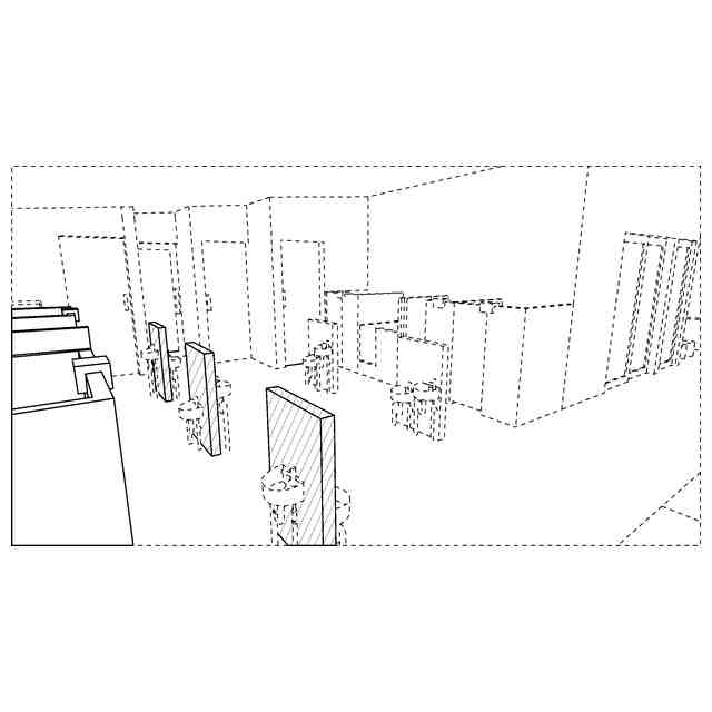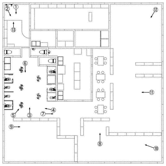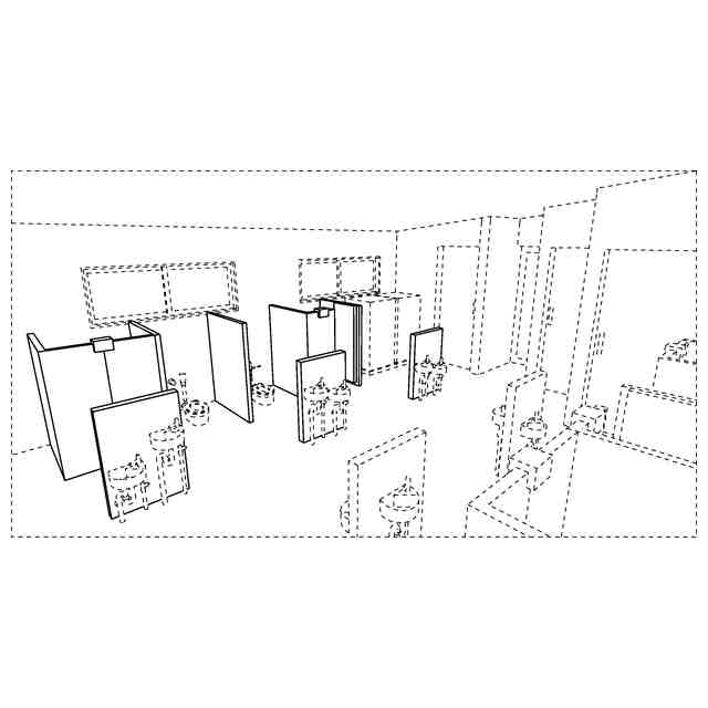 本願意匠は、保育園、幼稚園などの保育施設の内装である。保育施設のトイレスペースに、壁面及び床面に固定設置して使用される複数のトイレブースが設けられる。トイレブースはドア(個室扉)があるブース、ドア(個室扉)がないブースがある。トイレブースのドアは、ドアロックをスライドすることで開閉することができる。ドアロックがトイレブースの略中央部に位置する時は、ドアが閉じている状態である。手洗い洗面器設置壁は、床面に固定設置して使用され、すりガラスなど透光性を有する材料により構成されている。これにより便器への視線を適度に遮ることができる。なお、各図においてドアがあるトイレブースは、ドアが開いている状態のトイレブースと、ドアが閉じている状態のトイレブースを図示している。
