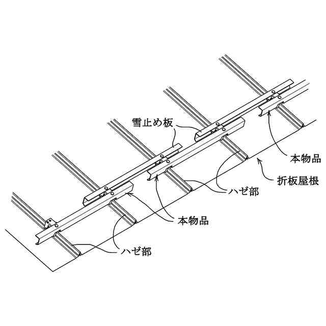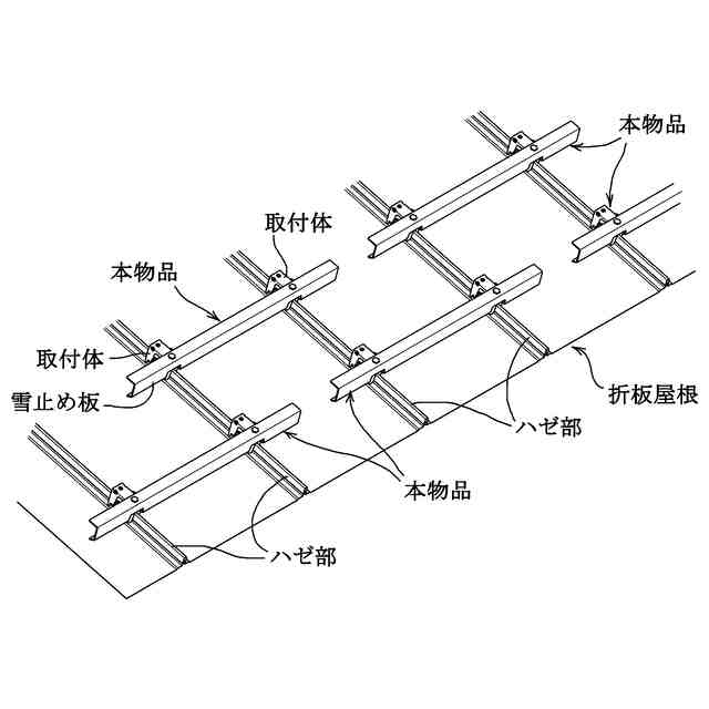 本物品は、「参考斜視図」及び「参考底面図」に図示したように、左右一対の取付体に雪止め板を設けた雪止め金具であって、この取付体を折板屋根のハゼ部に締付固定用ボルトを用いて挟持固定する。なお、「使用状態を示す参考図1」に図示したように使用したり、「使用状態を示す参考図2」に図示したように、折板屋根に取り付けた取付体の上面に設けられた螺子孔を用いて、取付体の後端に別の雪止め板を取り付けることもできる。