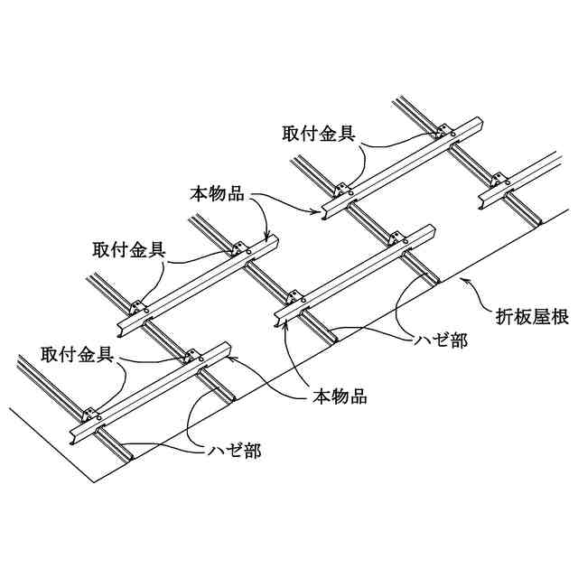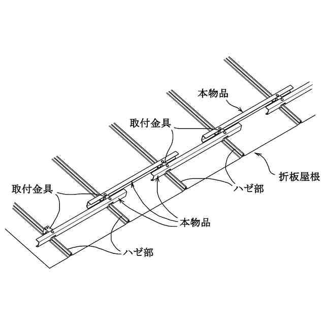 本物品は、「参考図」に図示したように、上面の左右二ヵ所に取付孔を設け、正面の左右二ヵ所に切欠き部を設けた雪止め板であって、「使用状態を示す参考図1」及び「使用状態を示す参考図2」に図示したように、折板屋根のハゼ部に設置した取付金具に取り付けるものある。