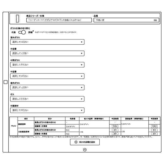 本画像は、建物開口部の熱貫流率及び日射熱取得率の性能値を自動算出して参照できるシステムに使用される画像であって、個別商品のガラス仕様の詳細を選択する操作画像である。「使用状態を示す参考図」に示すとおり、選択済みの商品について、プルダウンメニューからガラスの詳細仕様を選択することができ、選択された仕様の性能値を画像下方の表で参照することが可能である。