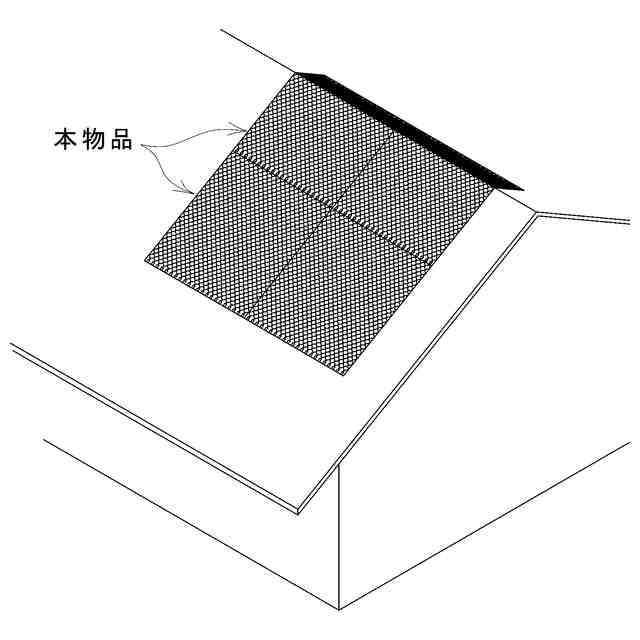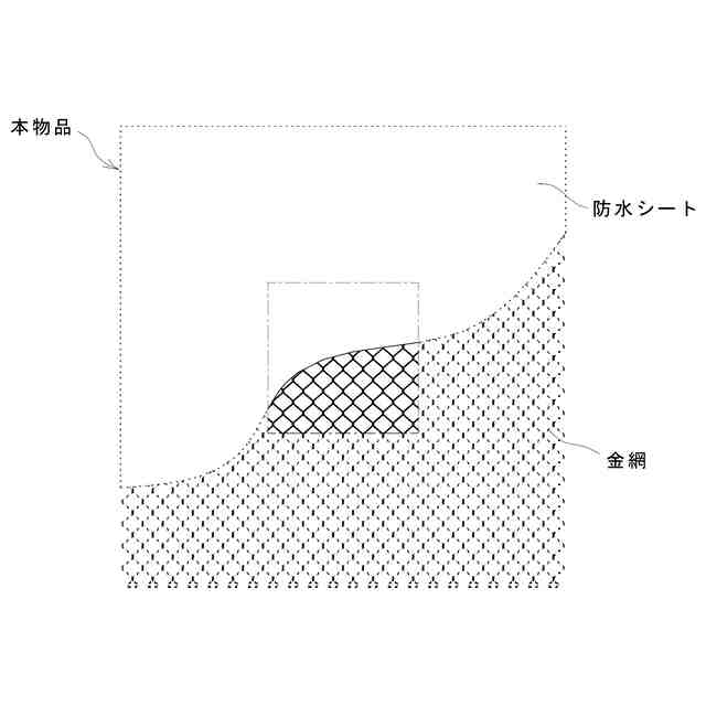 本物品は、防水シートの上に金網を重ねたものであって、使用状態を示す参考斜視図の如く、必要に応じて複数枚連結し、屋根の破損個所を覆うようにして使用する。