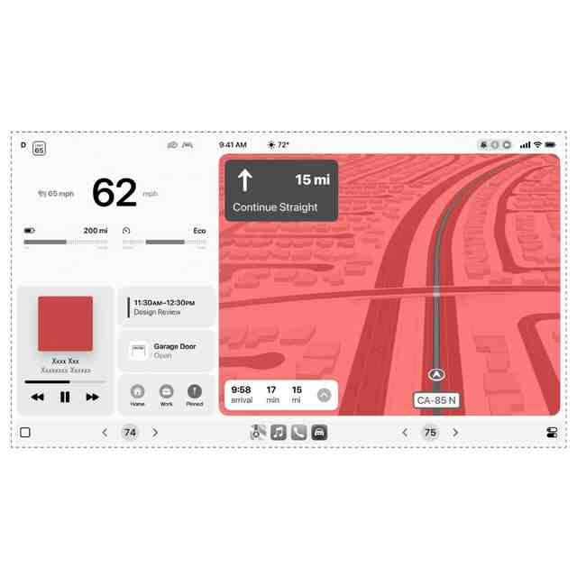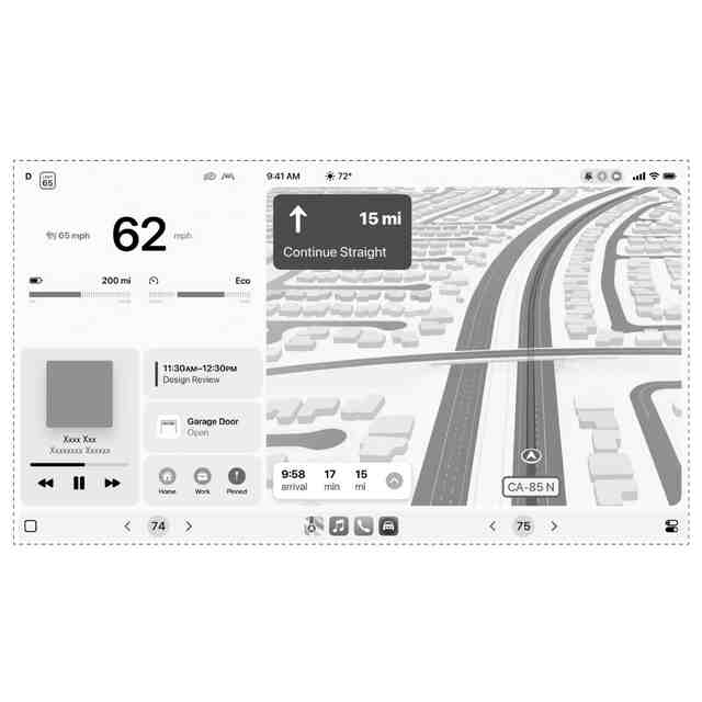 本画像は、例えば、情報及び選択肢を表示し、選択肢から選択をするために用いられる画像であり、例えば、速度、ナビゲーション、速度リミッター、車/装置状況等を含む、車または他の装置の操作及び制御に関する情報と選択肢、及び時間、気温、天気、スケジュール、地図等に関する情報と選択肢等を表示することができる。