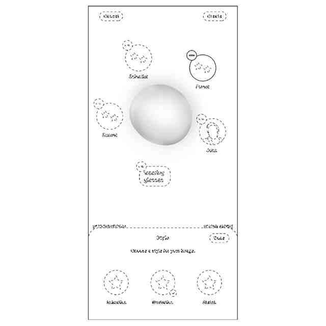 本願画像「画像生成用画像」は、例えば、AI(人工知能)により既存の画像や情報に基づいて新たな画像を生成するために、画像や情報を選択する際に表示される画像である。画像や情報が選択されると、その画像や情報が中央部分の周りに表示される。