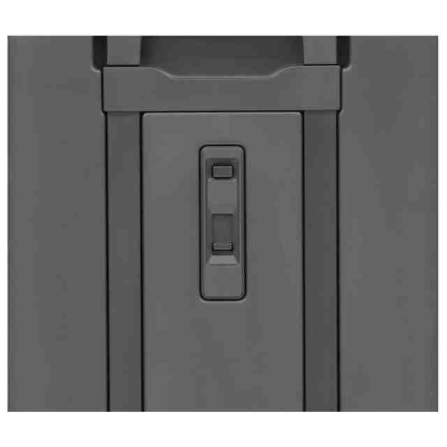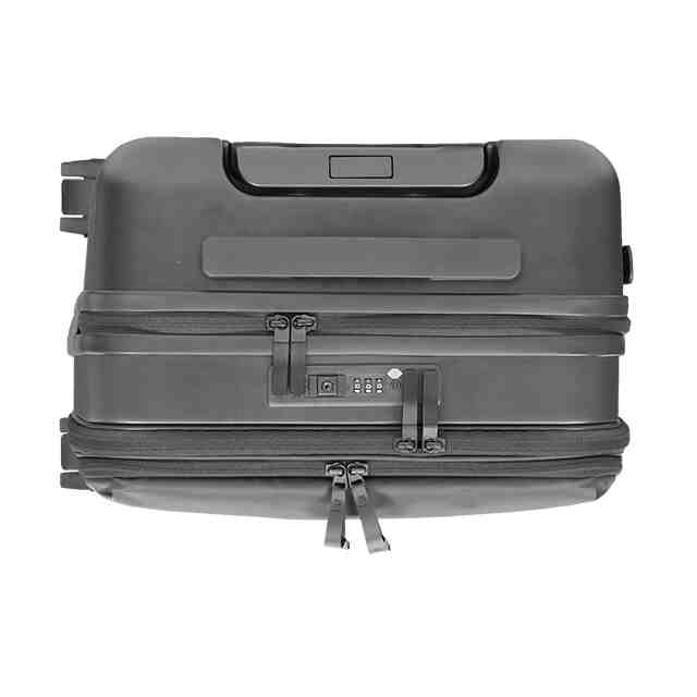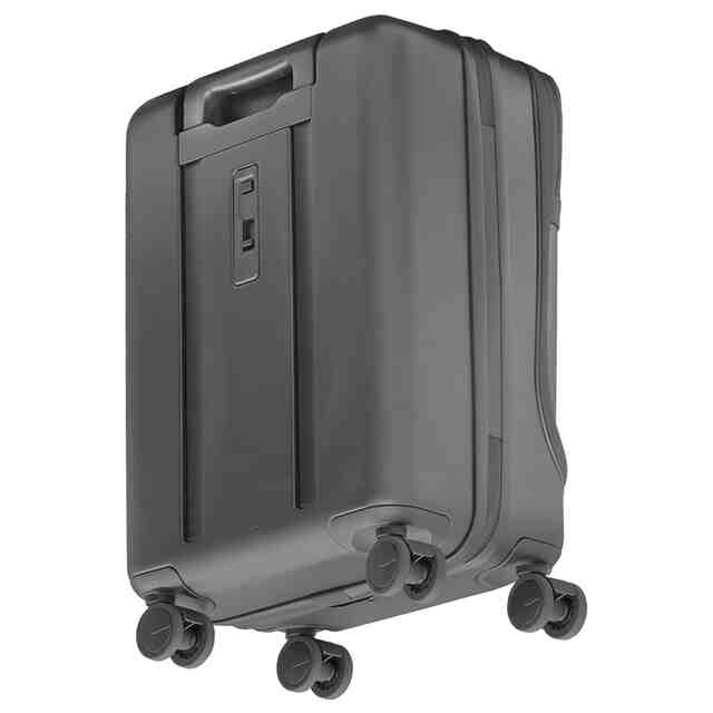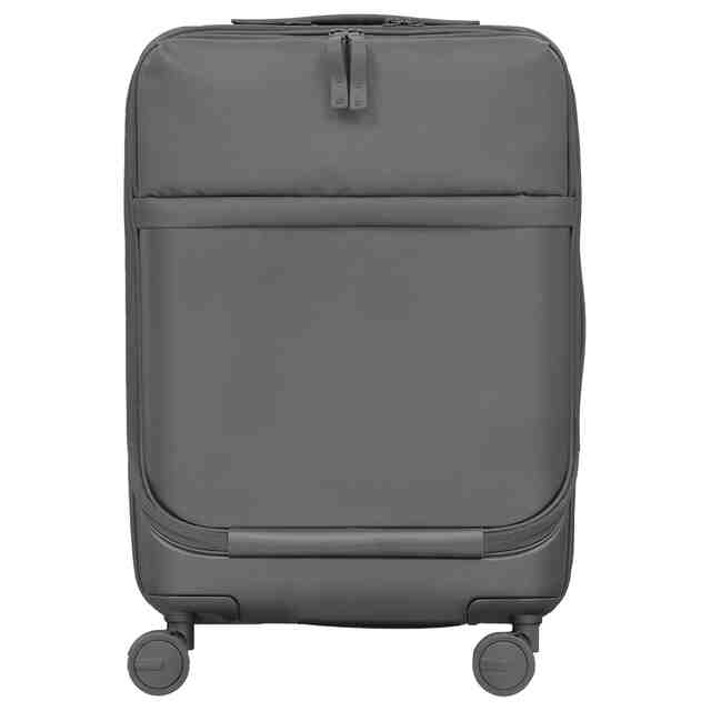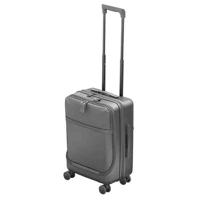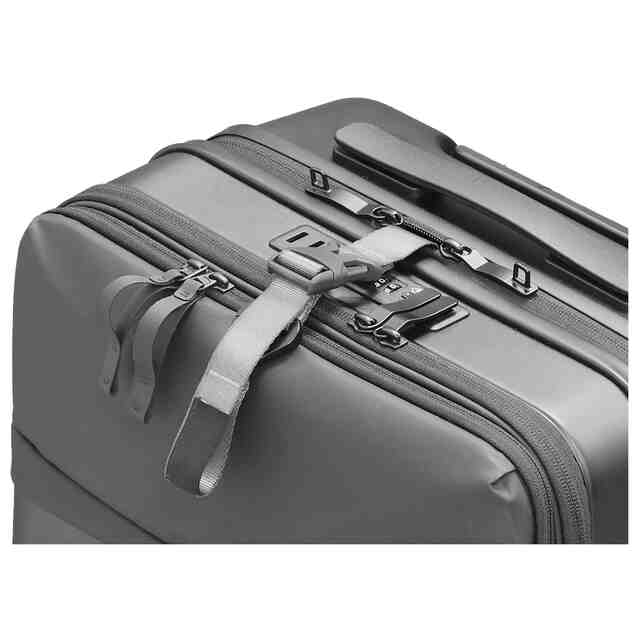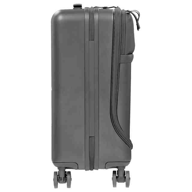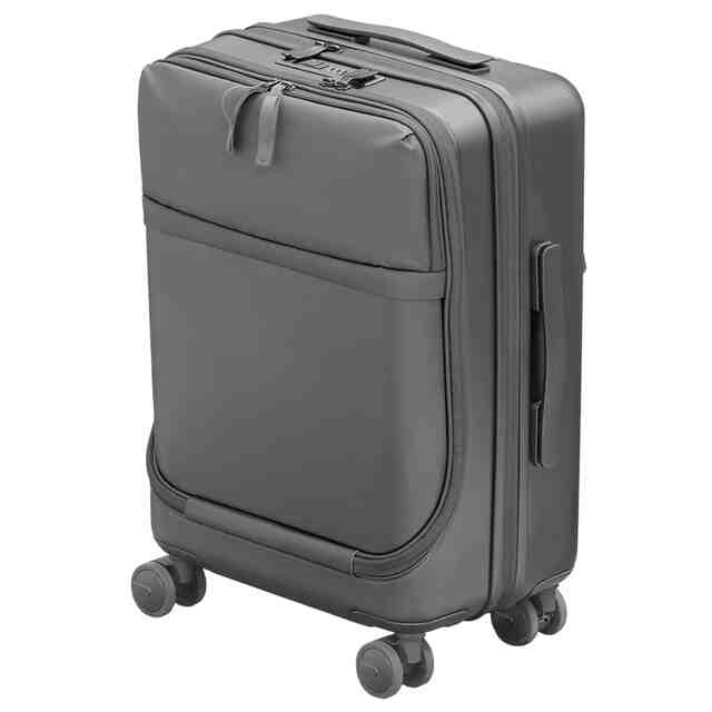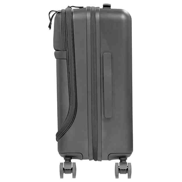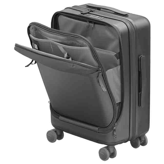 本物品はキャリーケースであり、ハードなフロントポケットの上部に生地のポケットが配置されている。