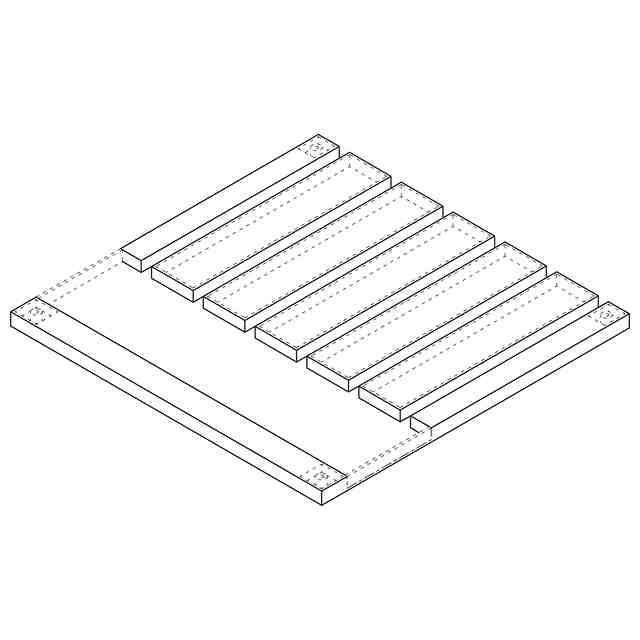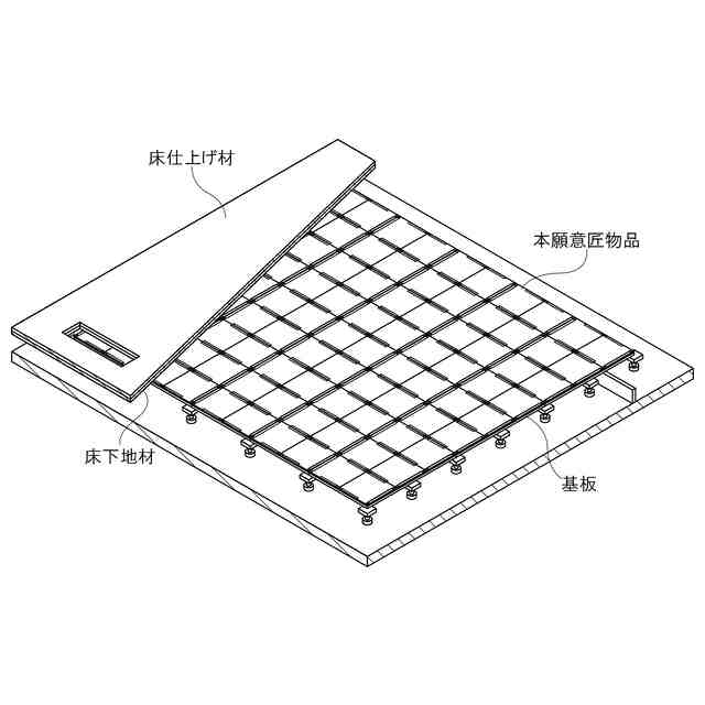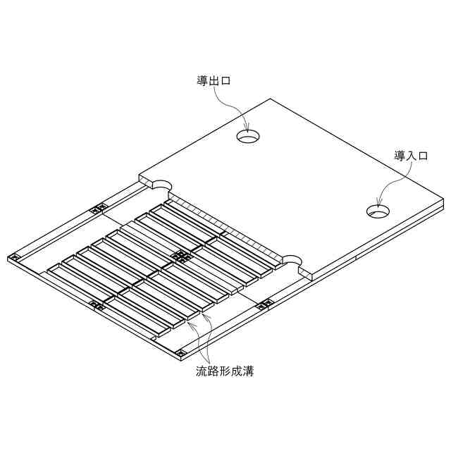 本願意匠に係る物品は、冷暖房が行われる部屋の床に設置される冷暖房用輻射パネルであって、本物品の大きさは、正面図において各辺が約300mmである。「使用状態を示す参考図5」に示すとおり、1枚の基板の上に本物品を複数配置したものを配列し、さらにその上面に床下地材及び床仕上げ材を設置して使用される。「各部の名称を示す参考図」に示すとおり、温度調節済み空気を基板に設けられた導入口から導出口に向けて流路形成溝に流すことで、冷熱又は温熱の輻射によって室内の冷暖房を行うことができる。