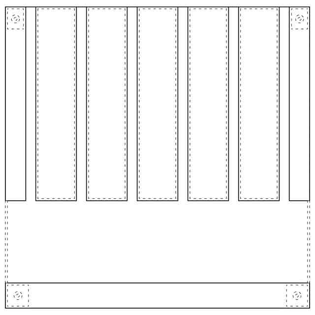 実線で表した部分が、部分意匠として意匠登録を受けようとする部分である。右側面図は左側面図と対称に表れるため省略する。一点鎖線は部分意匠として意匠登録を受けようとする部分とその他の部分との境界のみを示す線である。