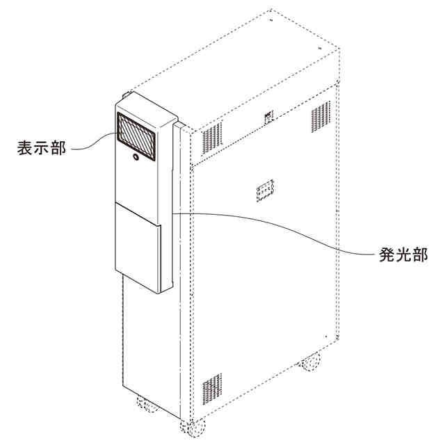 本物品は、平板状の正面部の上側に、表示部を正面上側に、発光部を左右側面に有する縦長略直方体状部を備えた純水製造機である。本物品は、水等から不純物を取り除くことにより純水等を製造する。表示部はタッチパネル式で操作に使用する。発光部は細長帯状の孔部で、内蔵したLEDの光を外部に漏らすことで照明を行う。本物品は、給水口部から水等を取り入れて、送水口部から純水等を外部へと供給する。